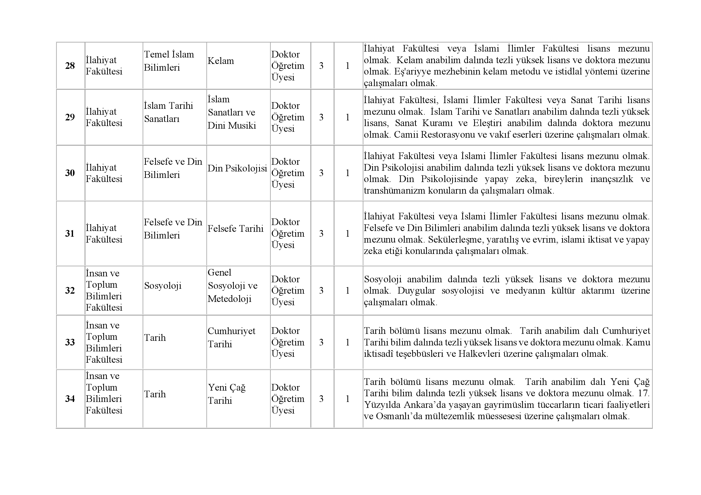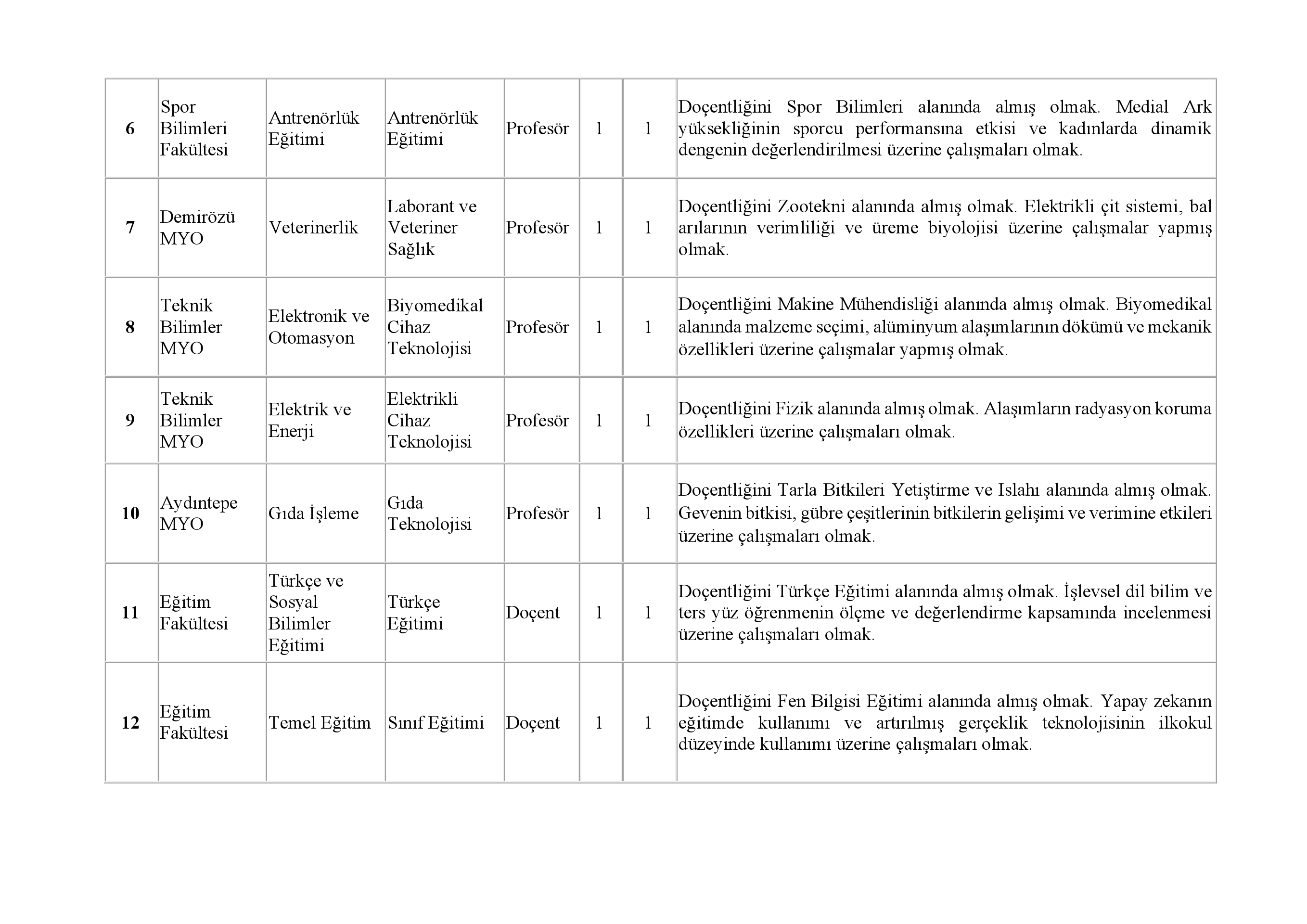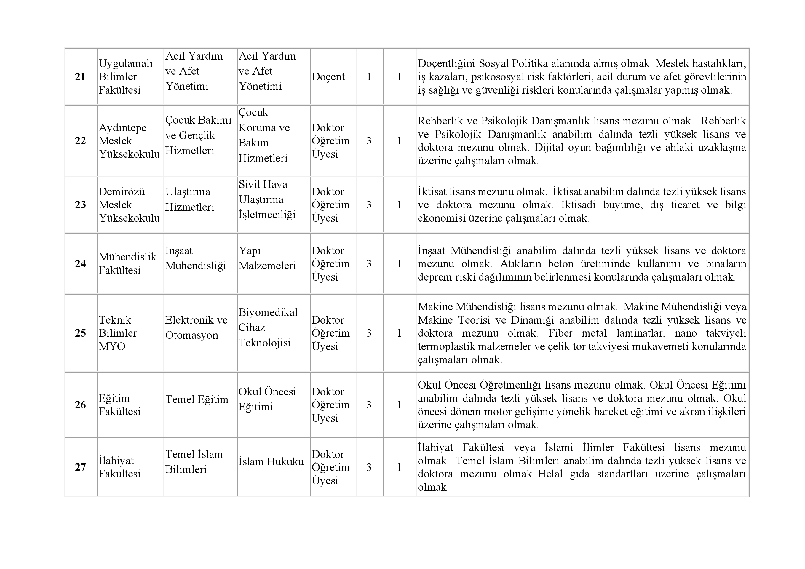 1- Profesör kadrosu için 2547 Sayılı Kanun'un 26. maddesinde, Doçent kadrosu için 2547 Sayılı Kanun'un 24. maddesinde, Doktor Öğretim Üyesi kadroları için 2547 Sayılı Kanun'un 23. maddesinde belirtilen şartlara ve 657 sayılı DMK'nun 48 inci maddesi uyarınca Devlet hizmetine girmede aranan şartlara haiz olmaları gerekmektedir.
