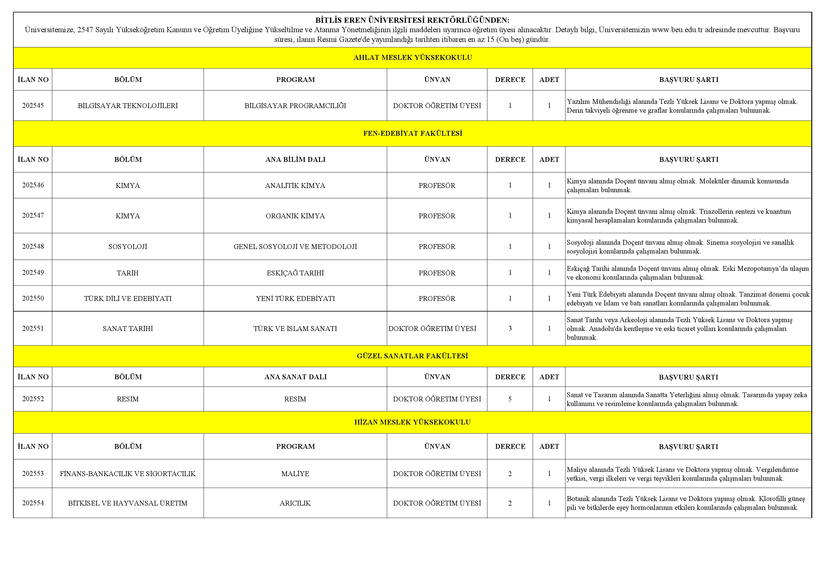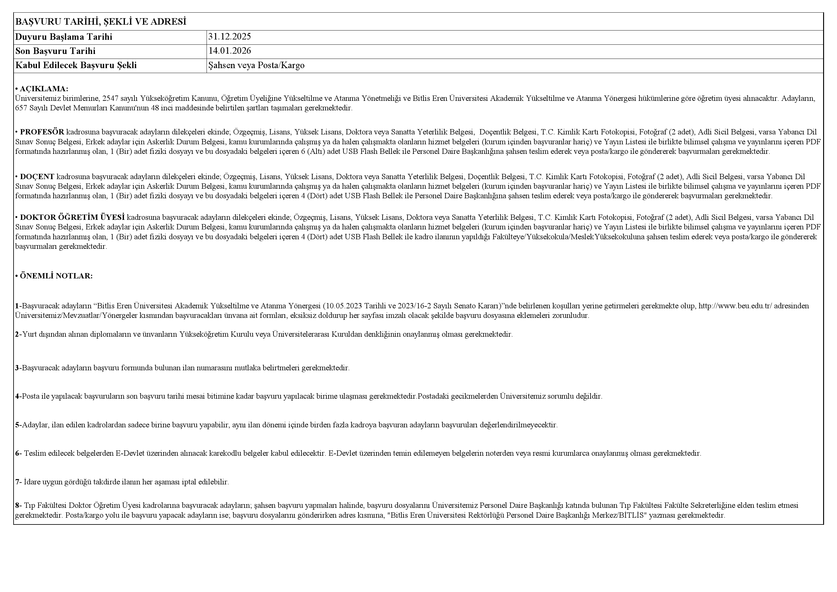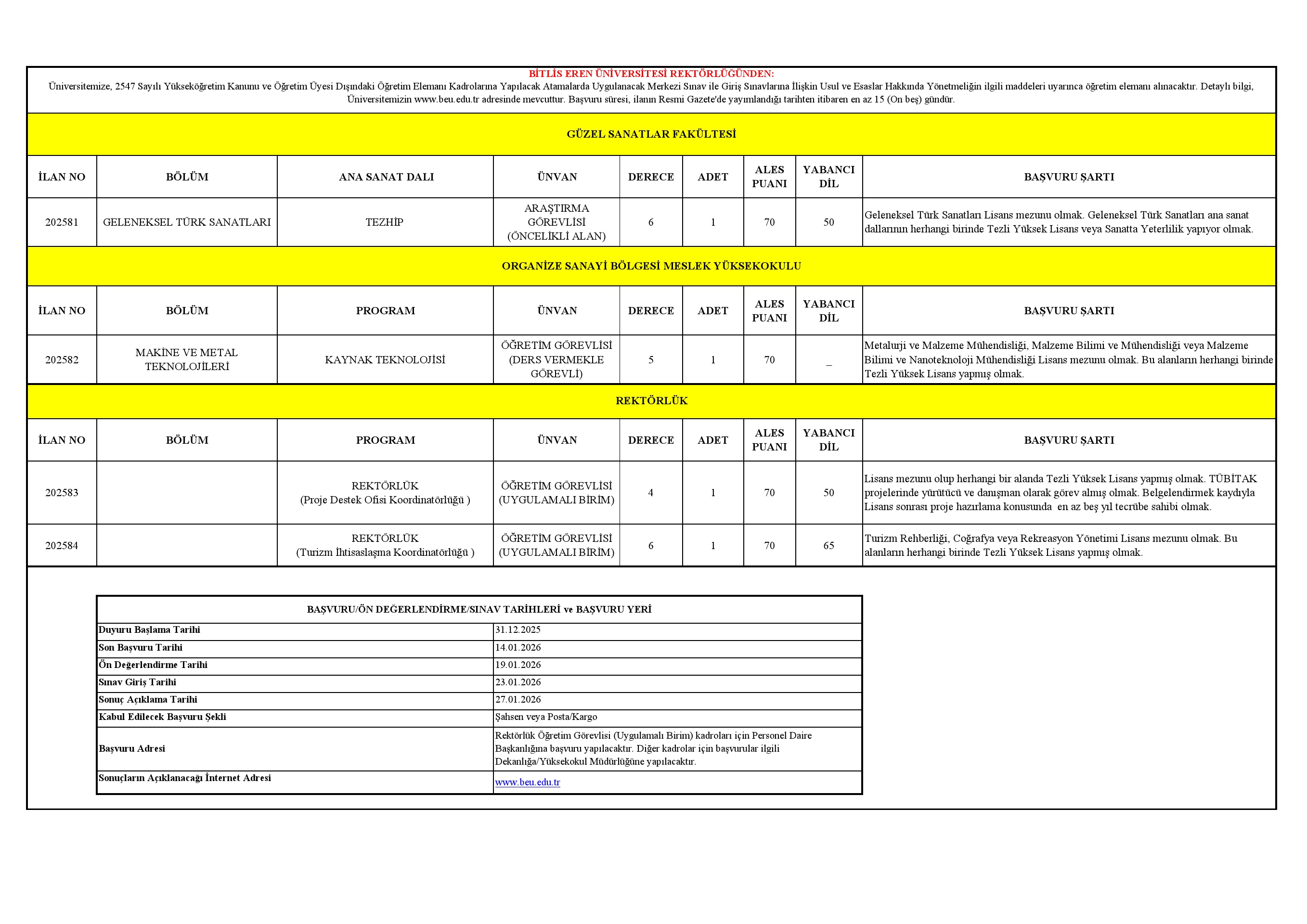 Bitlis Eren Üniversitesi Öğretim Üyesi ve Elemanı Alım İlanı. Son başvuru tarihi 14 Ocak 2026