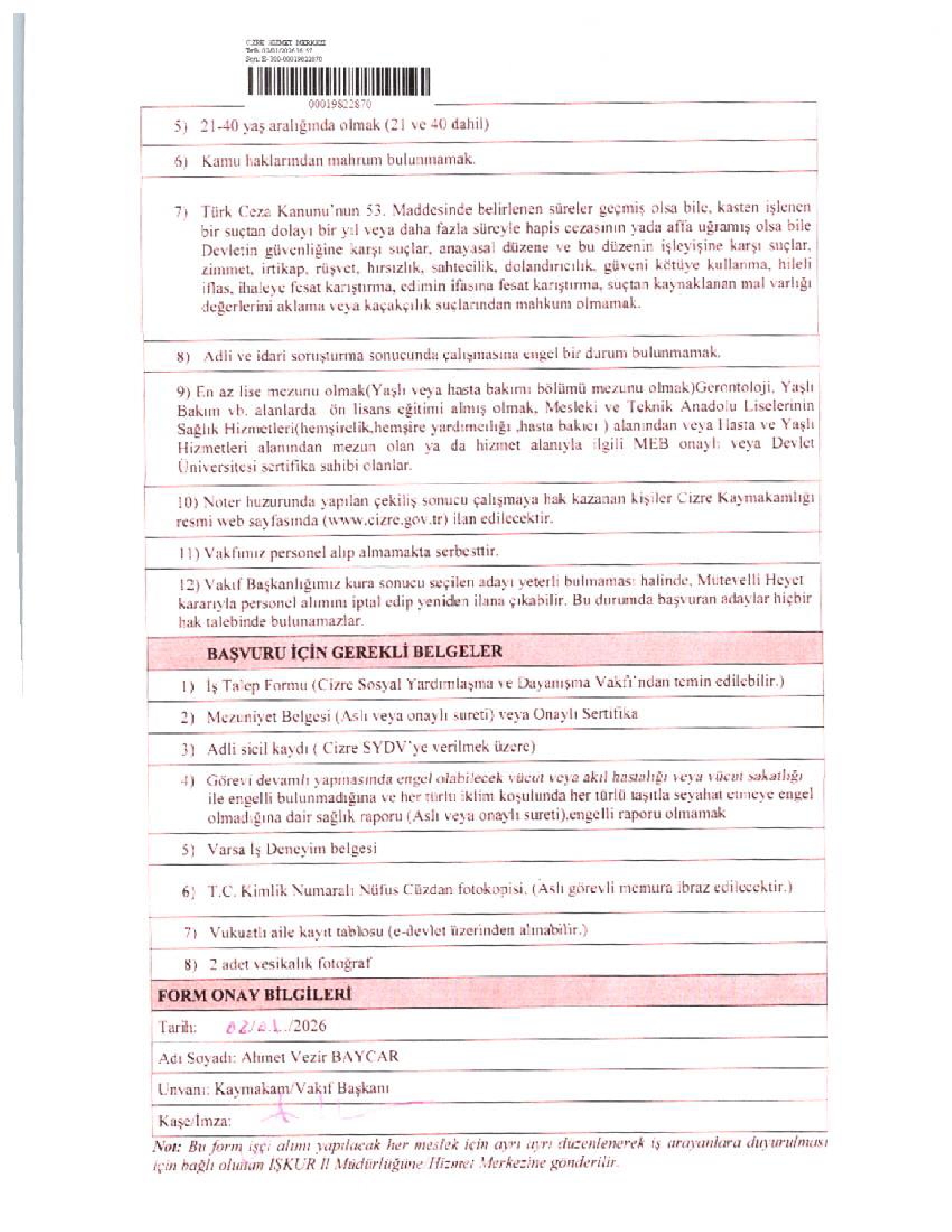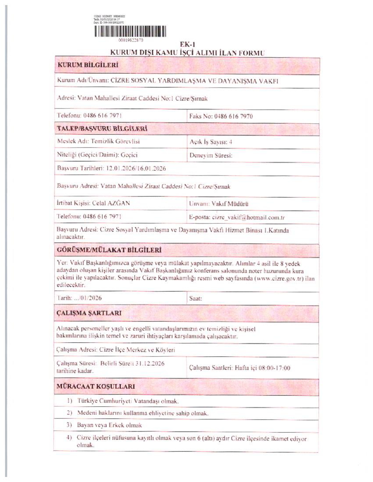 Ana sayfaSYDV İlanlarıAna sayfaGeçici İşçi İlanları Şırnak Cizre SYDV Geçici 4 İşçi Alacak Şırnak Cizre SYDV Geçici 4 İşçi Alacak. Son başvuru tarihi 16 Ocak 2026 Kaynak : İşkur İlan Giriş : 06 Ocak 2026 04:02, Son Güncelleme : 06 Ocak 2026 04:53 Yazdır Yorumlar (0) Abone Ol