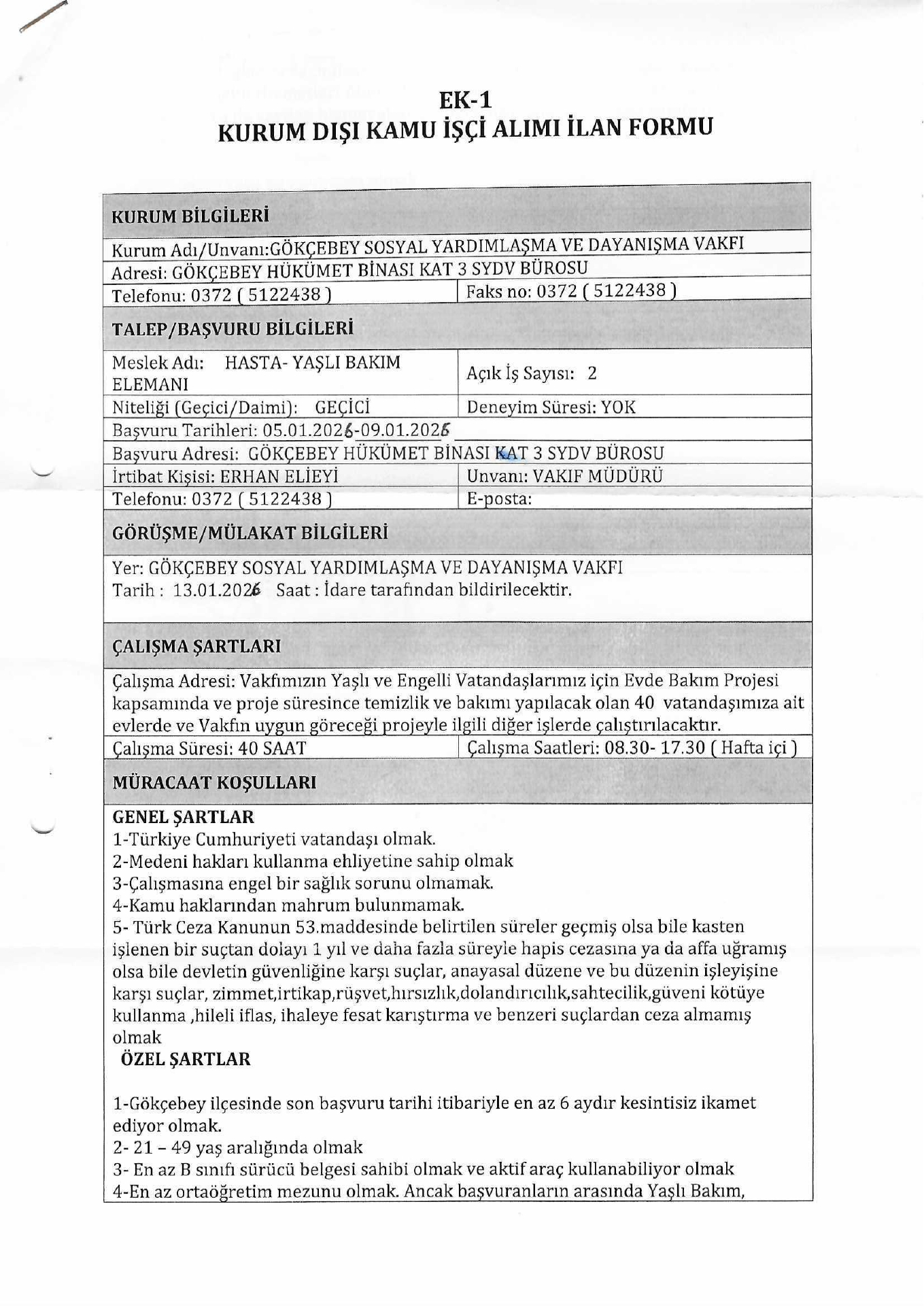 Ana sayfaSYDV İlanlarıAna sayfaGeçici İşçi İlanları Gökçebey SYDV Geçici 2 İşçi Alacak Gökçebey SYDV Geçici 2 İşçi Alacak. Son başvuru tarihi 9 Ocak 2026 Kaynak : İşkur İlan Giriş : 06 Ocak 2026 04:12, Son Güncelleme : 06 Ocak 2026 04:51 Yazdır Yorumlar (0) Abone Ol