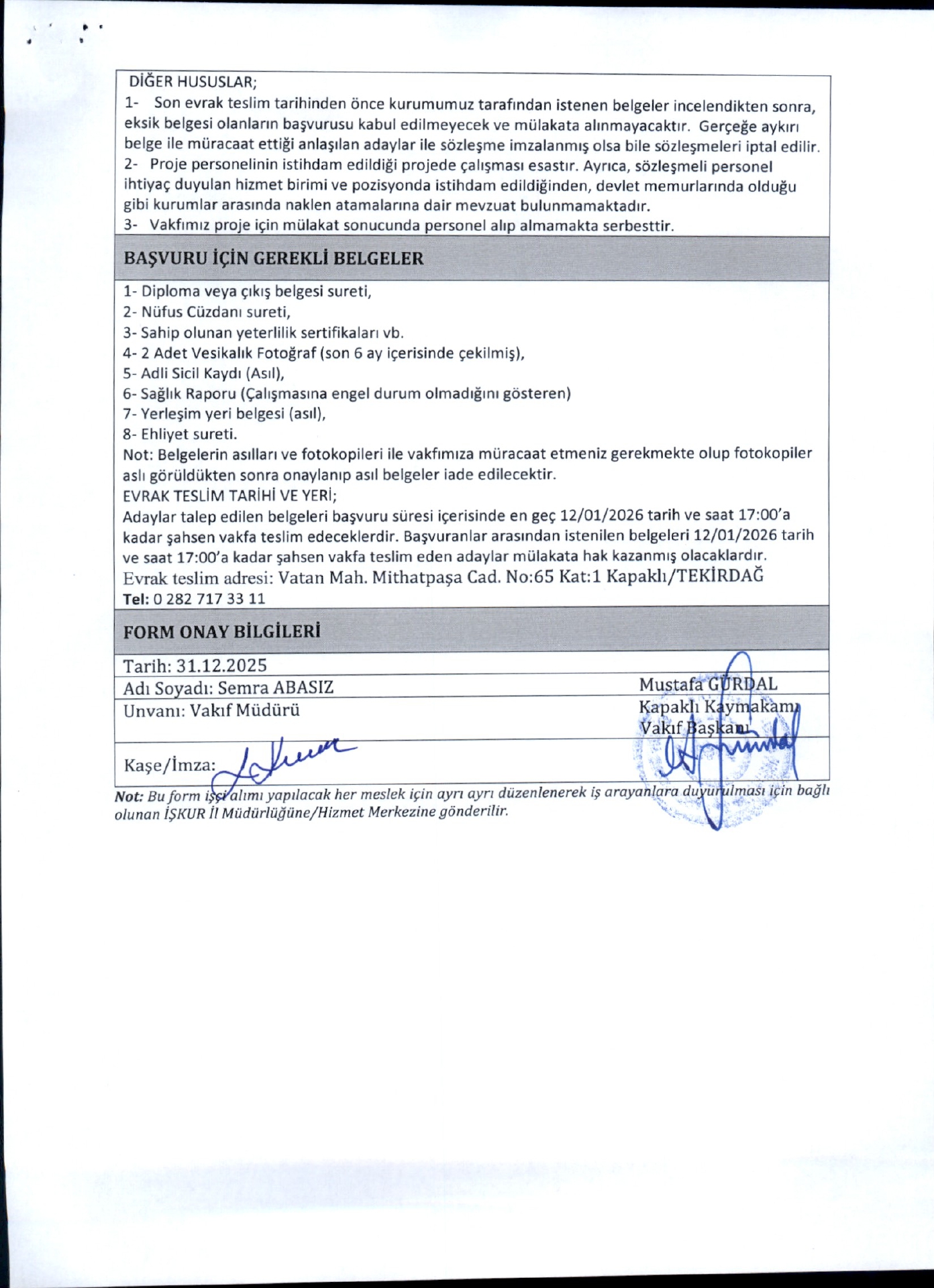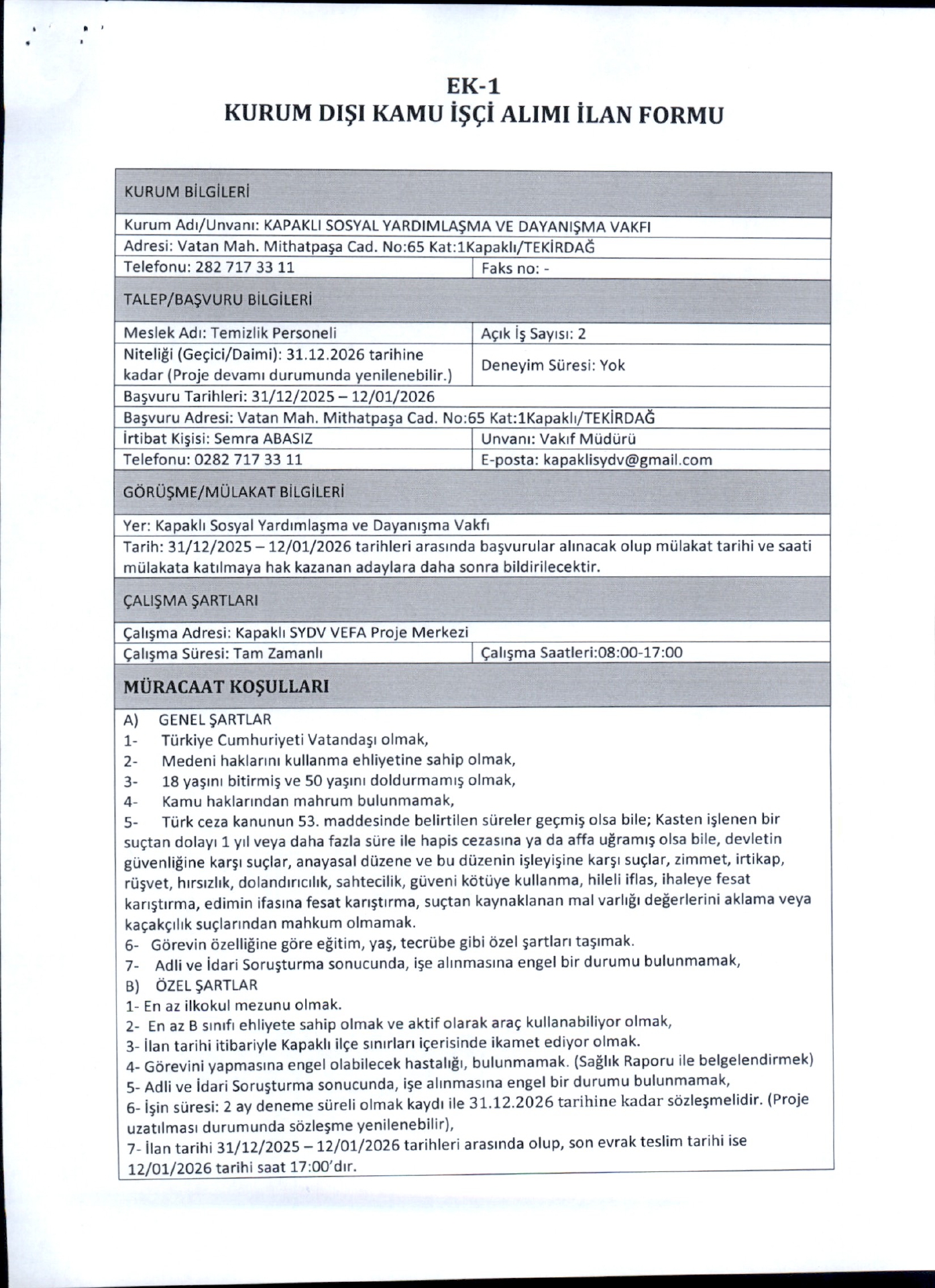 Ana sayfaSYDV İlanlarıAna sayfaGeçici İşçi İlanları Tekirdağ Kapaklı SYDV Geçici 2 İşçi Alacak Tekirdağ Kapaklı SYDV Geçici 2 İşçi Alacak. Son başvuru tarihi 12 Ocak 2026 Kaynak : İşkur İlan Giriş : 06 Ocak 2026 04:15, Son Güncelleme : 06 Ocak 2026 04:50 Yazdır Yorumlar (0) Abone Ol