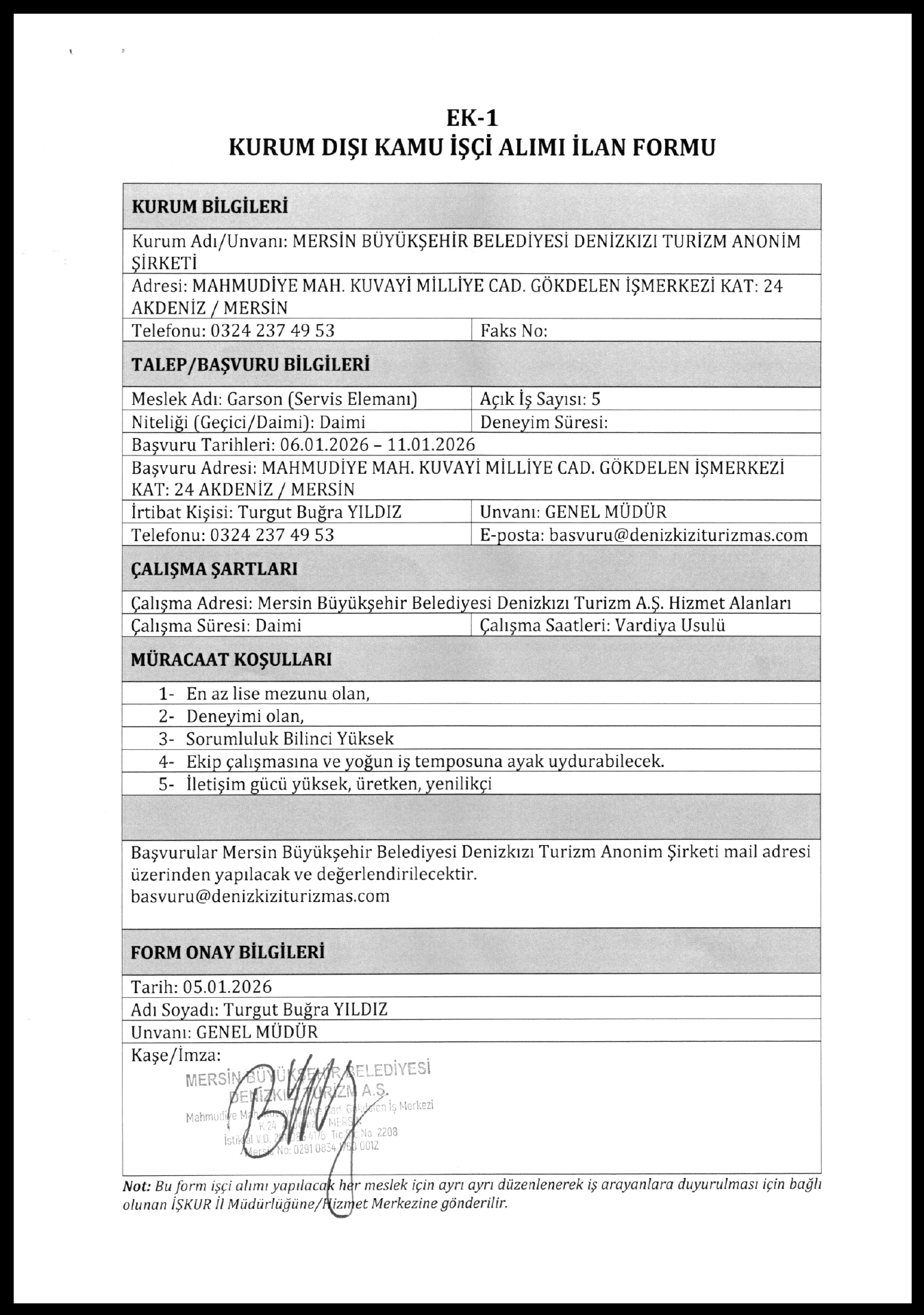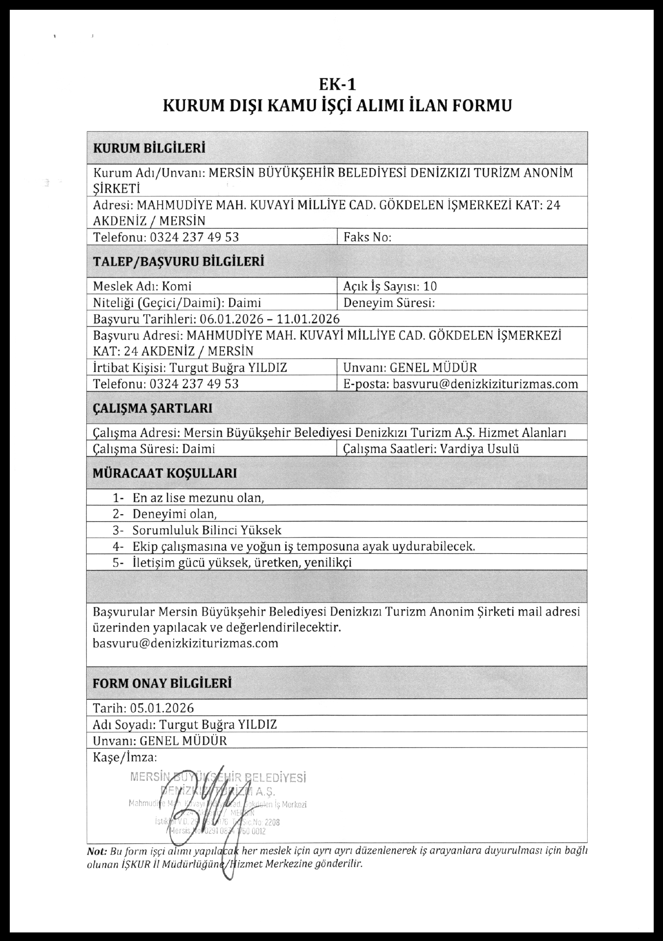 Ana sayfaDaimi İşçi İlanları Mersin Büyükşehir Belediyesi 17 İşçi Alacak Mersin Büyükşehir Belediyesi 17 İşçi Alacak. Son başvuru tarihi 11 Ocak 2026 Kaynak : İşkur İlan Giriş : 06 Ocak 2026 04:21, Son Güncelleme : 06 Ocak 2026 04:48 Yazdır Yorumlar (0) Abone Ol