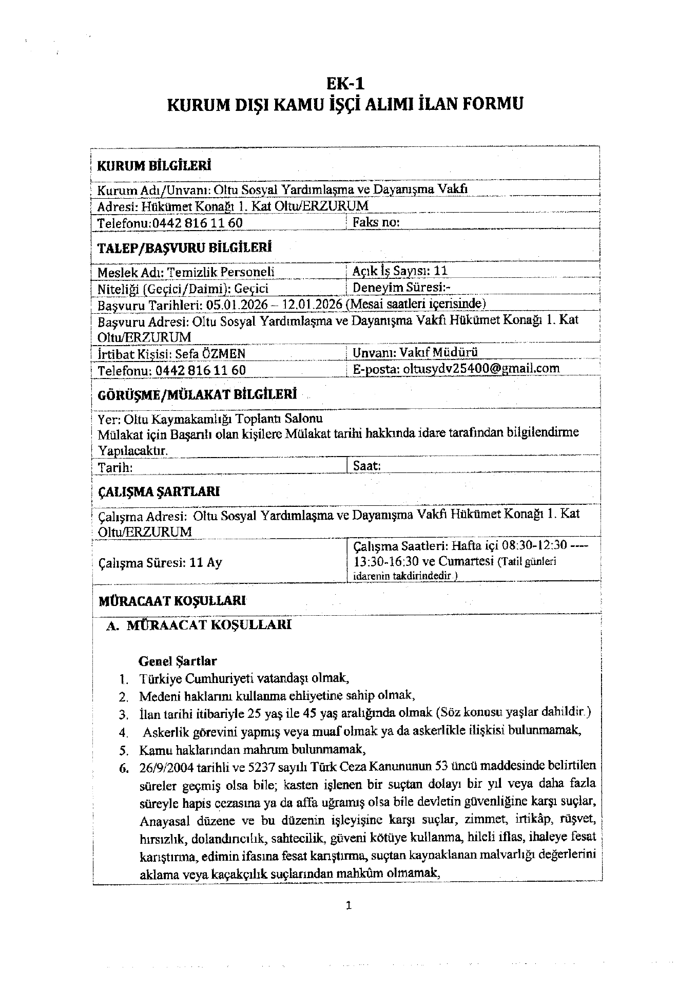 Ana sayfaSYDV İlanlarıAna sayfaGeçici İşçi İlanları Erzurum Oltu SYDV Geçici 11 İşçi Alacak Erzurum Oltu SYDV Geçici 11 İşçi Alacak. Son başvuru tarihi 12 Ocak 2026 Kaynak : İşkur İlan Giriş : 06 Ocak 2026 04:30, Son Güncelleme : 06 Ocak 2026 04:47 Yazdır Yorumlar (0) Abone Ol