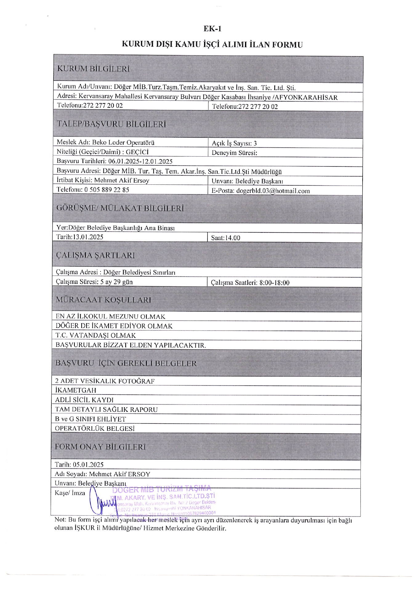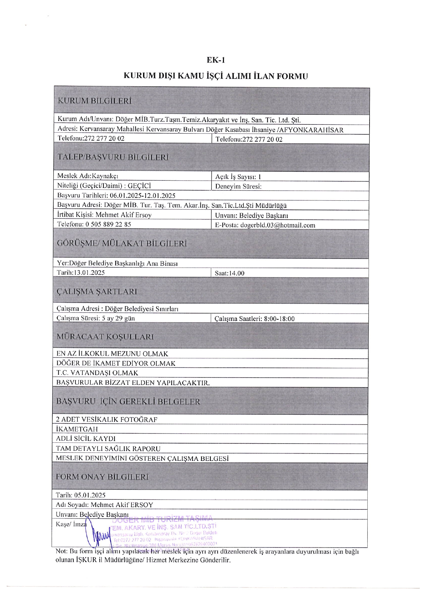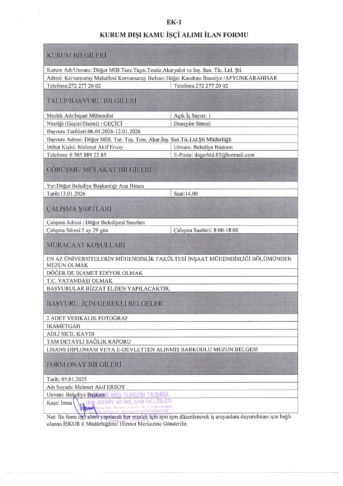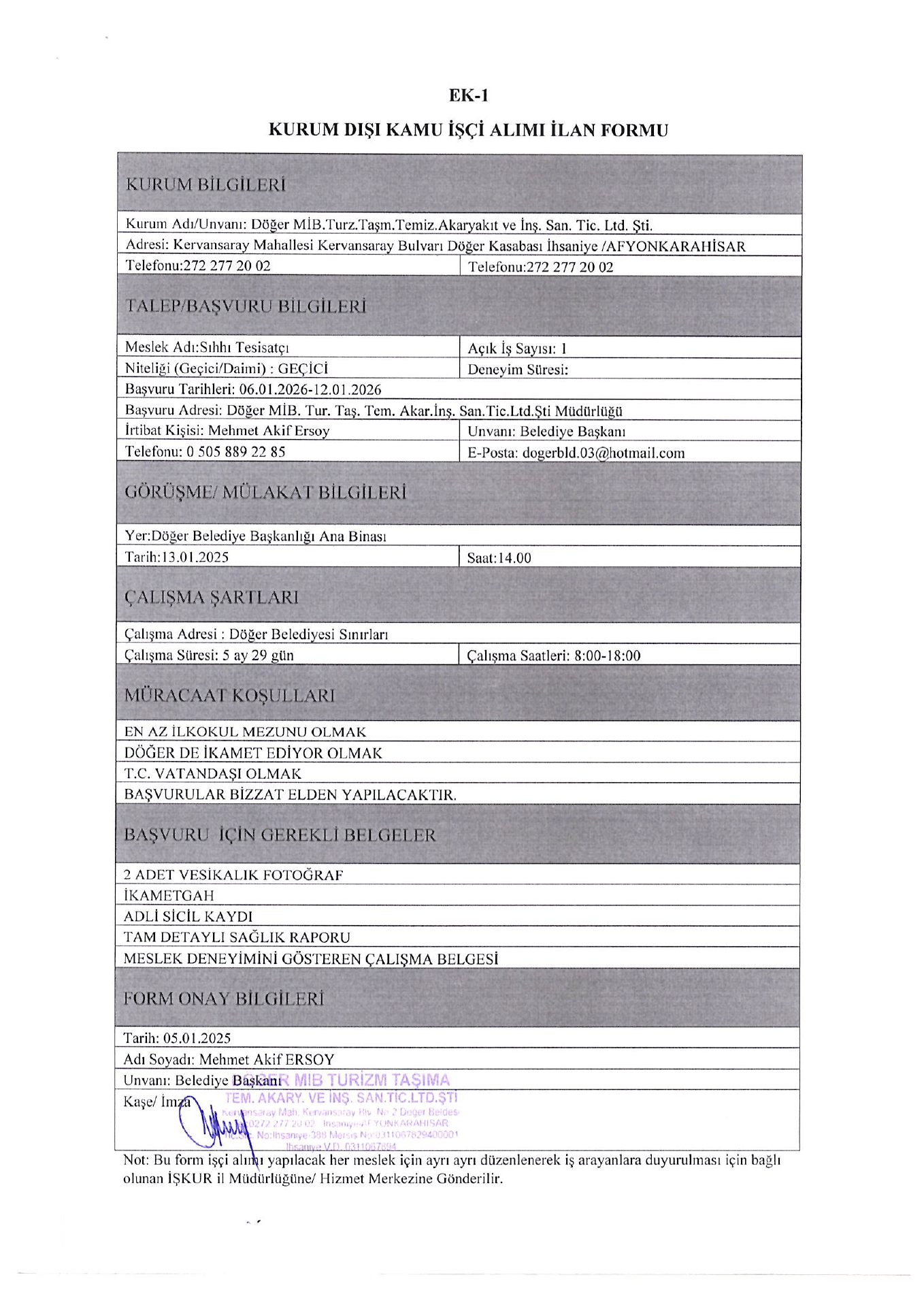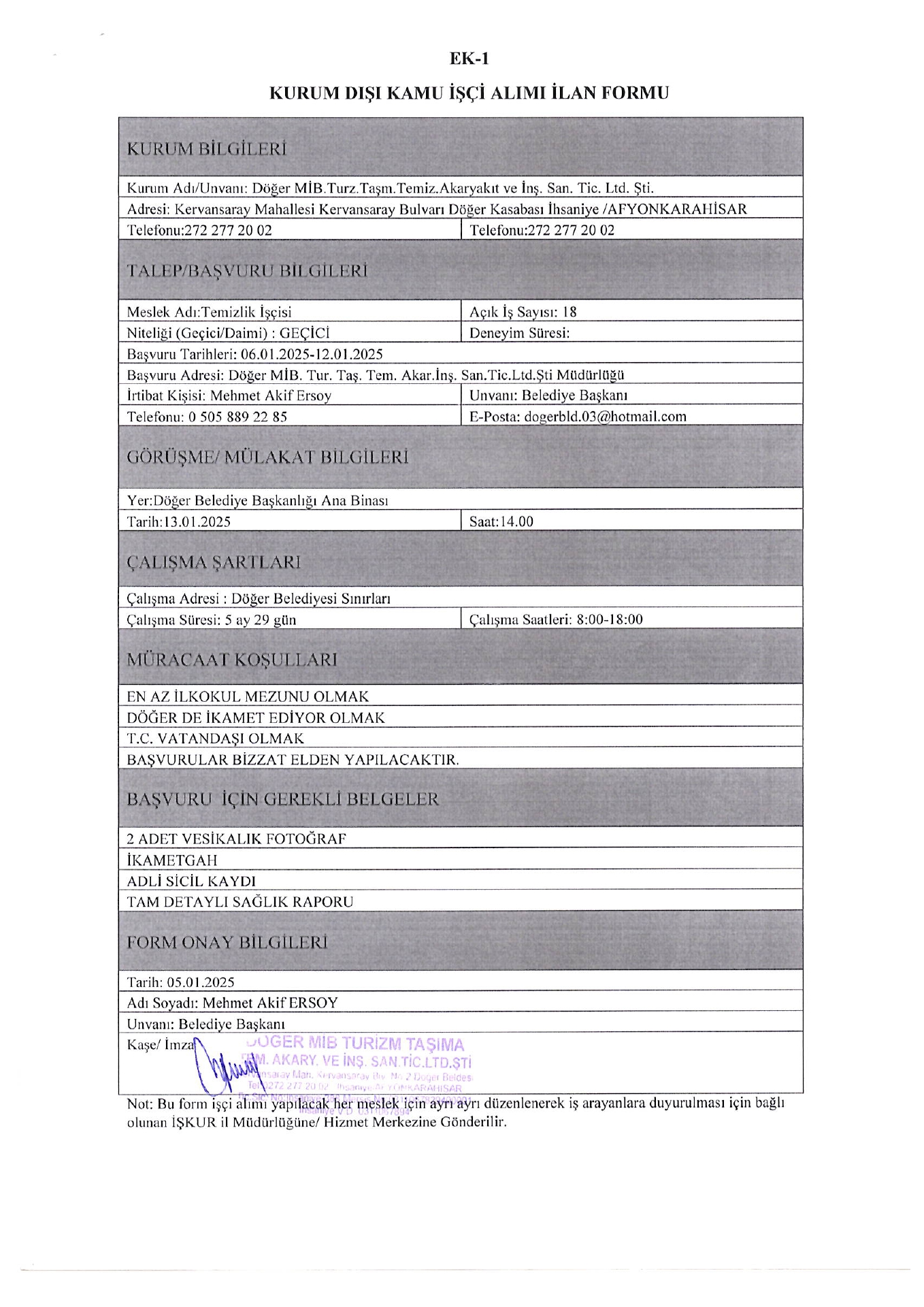 Ana sayfaGeçici İşçi İlanları Afyonkarahisar Döğer Mib Turizm Geçici 25 İşçi Alacak Afyonkarahisar Döğer Mib Turizm Geçici 25 İşçi Alacak. Son başvuru tarihi 12 Ocak 2026 Kaynak : İşkur İlan Giriş : 06 Ocak 2026 23:24, Son Güncelleme : 06 Ocak 2026 23:46 Yazdır Yorumlar (0) Abone Ol