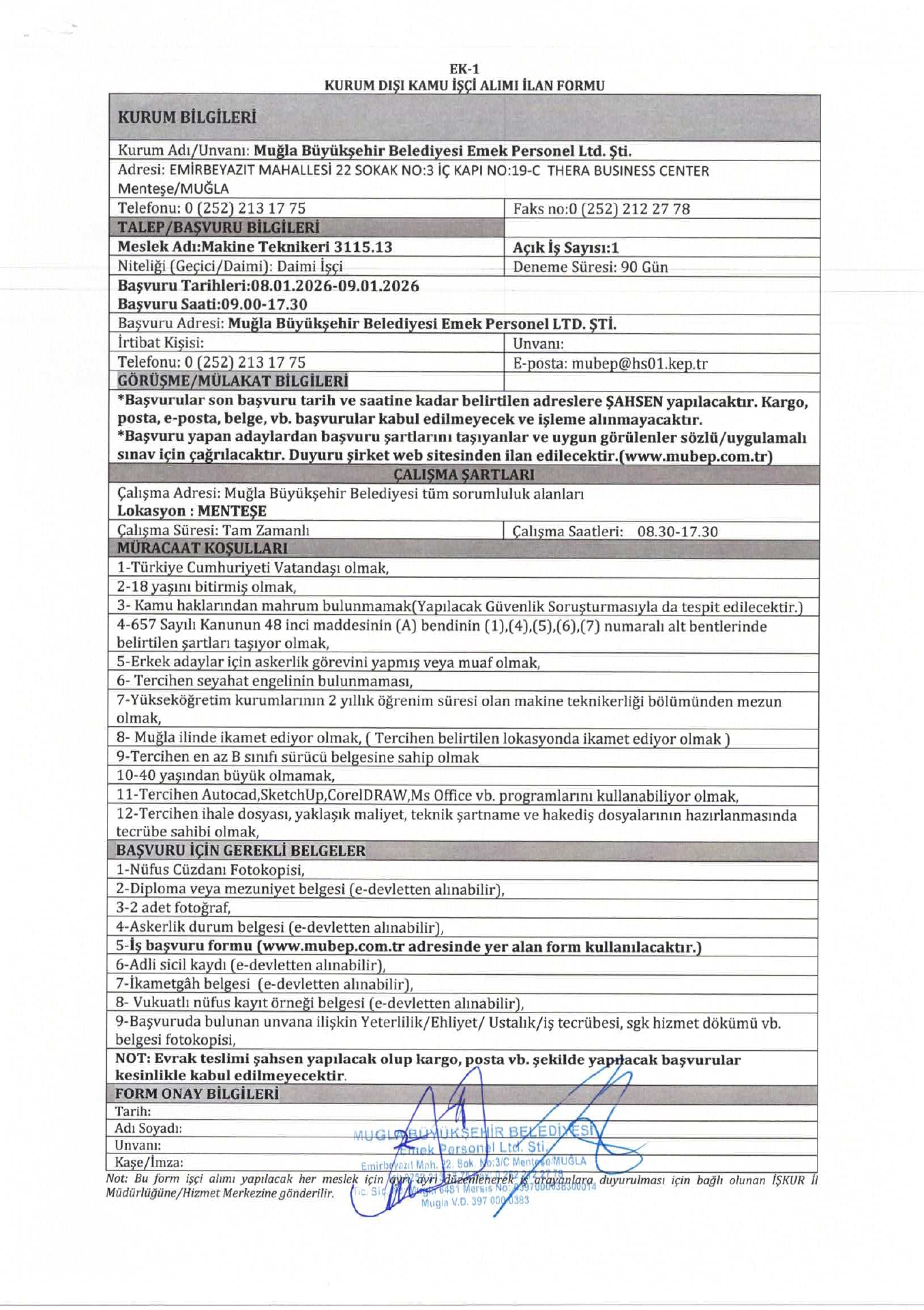 Ana sayfaDaimi İşçi İlanları Muğla Büyükşehir Belediyesi 1 İşçi Alacak Muğla Büyükşehir Belediyesi 1 İşçi Alacak. Son başvuru tarihi 9 Ocak 2026 Kaynak : İşkur İlan Giriş : 06 Ocak 2026 23:42, Son Güncelleme : 06 Ocak 2026 23:40 Yazdır Yorumlar (0) Abone Ol