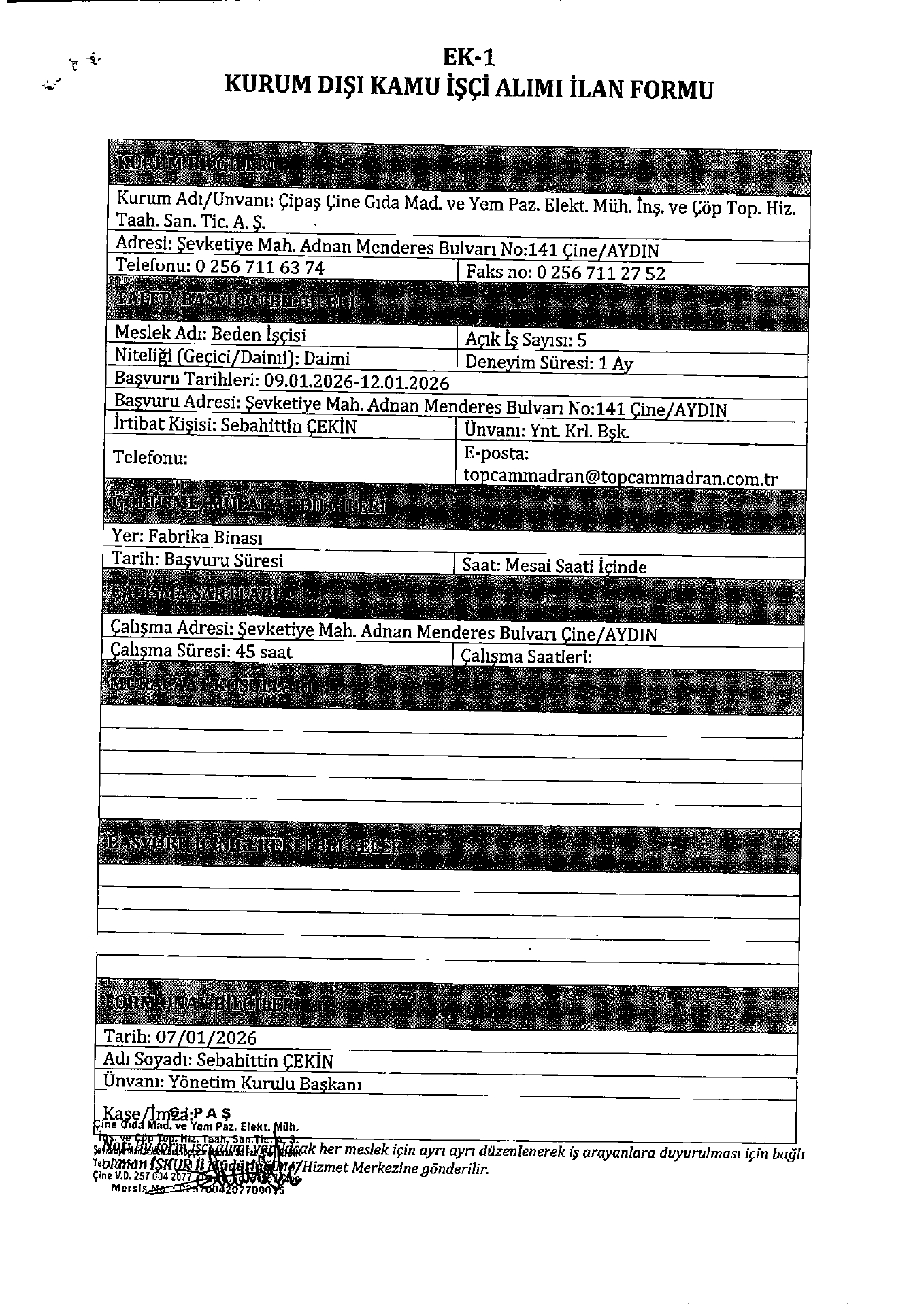 Ana sayfaDaimi İşçi İlanları Aydın Çine Çipas Gıda 5 İşçi Alacak Aydın Çine Çipas Gıda 5 İşçi Alacak. Son başvuru tarihi 12 Ocak 2026 Kaynak : İşkur İlan Giriş : 07 Ocak 2026 23:36, Son Güncelleme : 07 Ocak 2026 23:55 Yazdır Yorumlar (0) Abone Ol