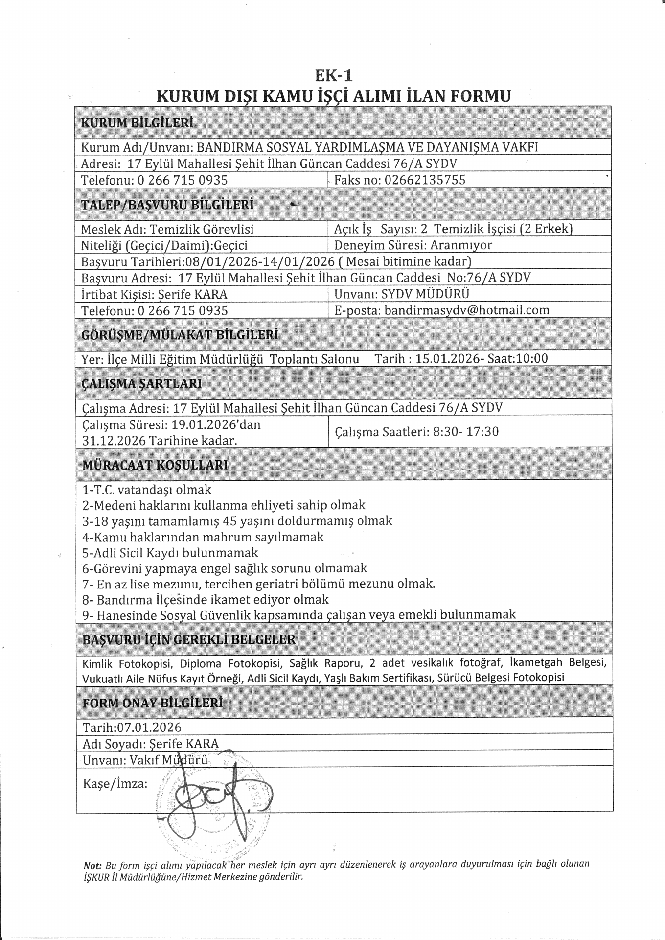 Ana sayfaSYDV İlanlarıAna sayfaGeçici İşçi İlanları Balıkesir Bandırma SYDV Geçici 2 İşçi Alacak Kaynak : İşkur İlan Giriş : 07 Ocak 2026 23:38, Son Güncelleme : 07 Ocak 2026 23:54 Yazdır Yorumlar (0) Abone Ol