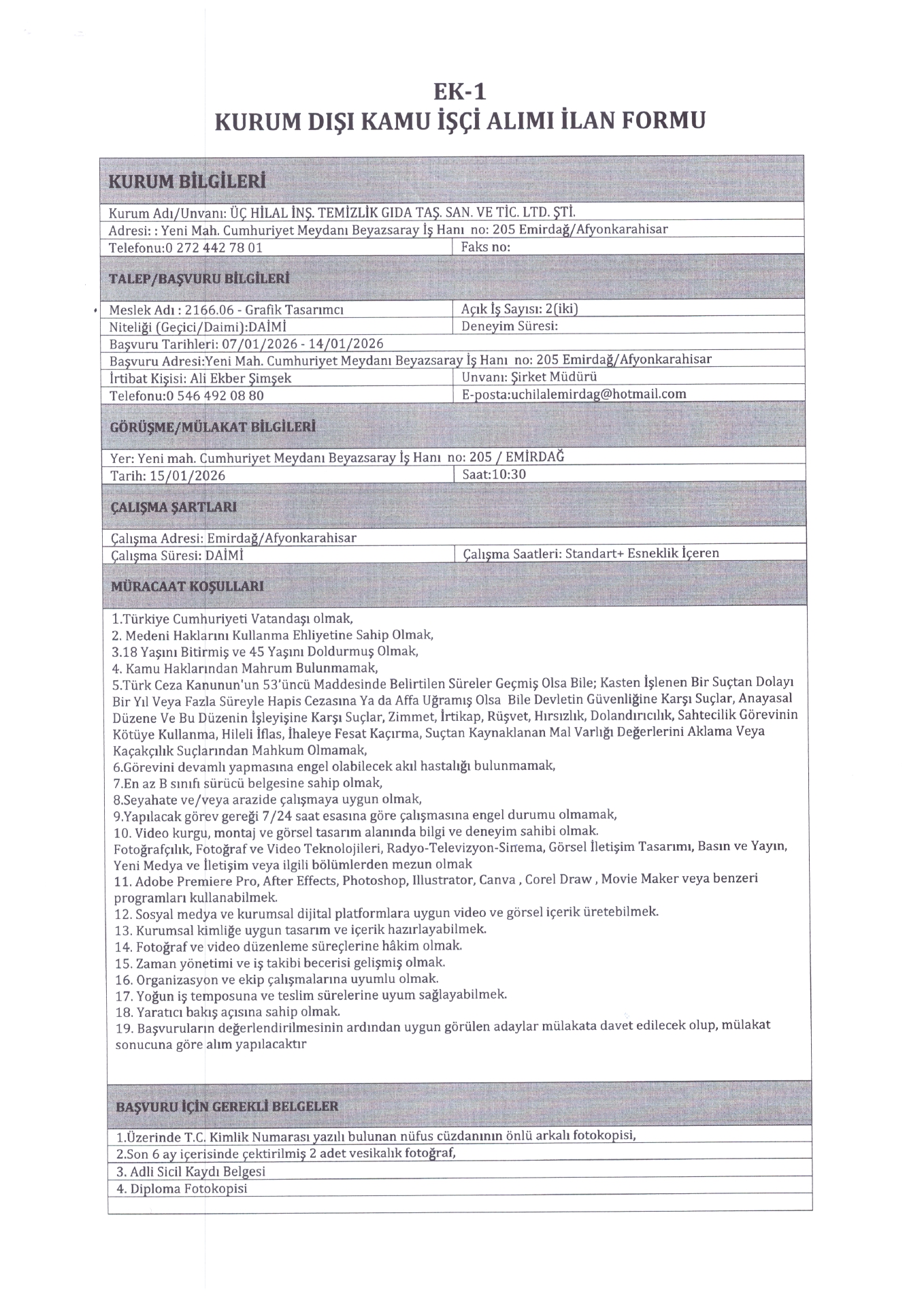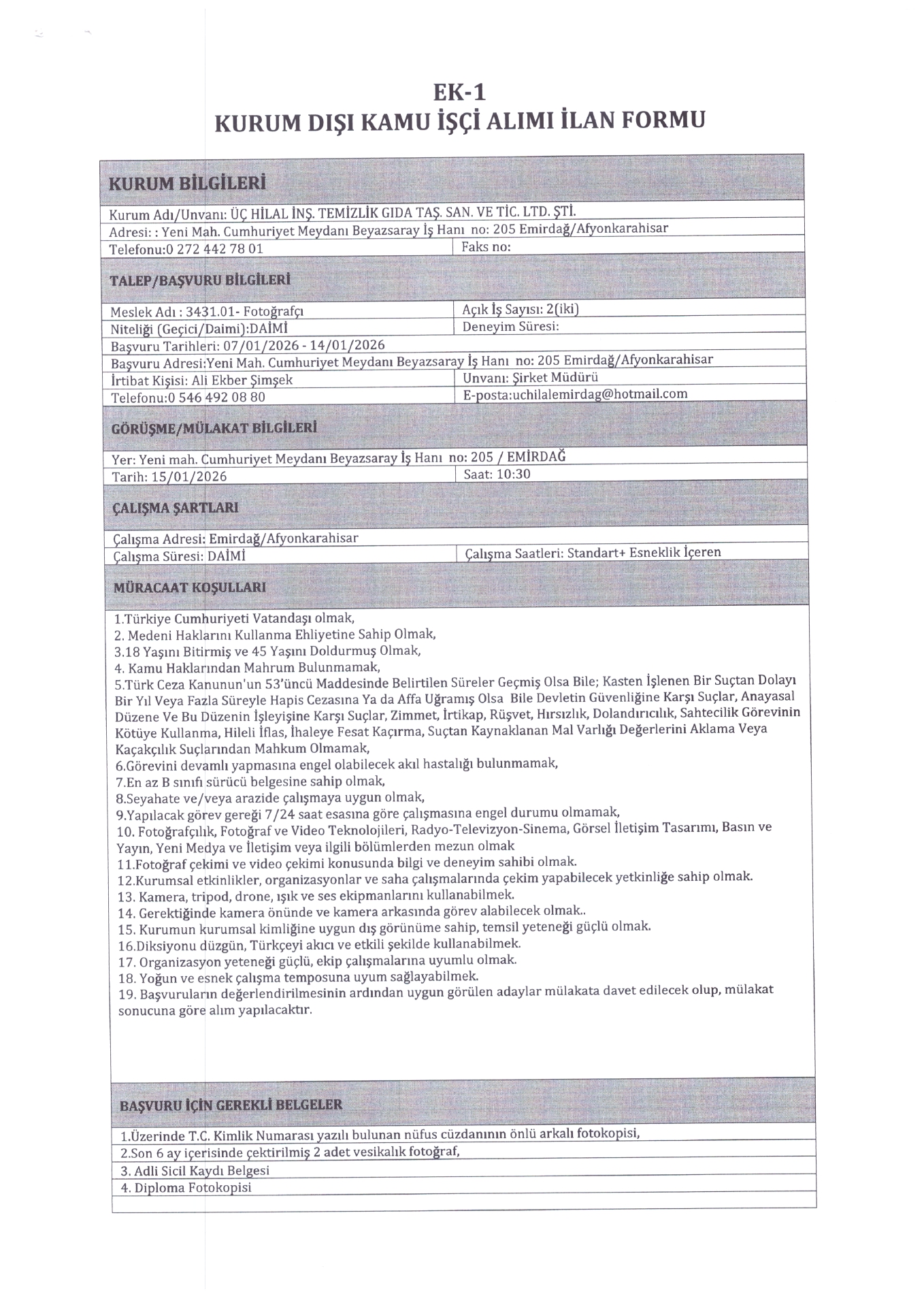 Ana sayfaDaimi İşçi İlanları Afyonkarahisar Üç Hilal Temizlik 4 İşçi Alacak Afyonkarahisar Üç Hilal Temizlik 4 İşçi Alacak. Son başvuru tarihi 14 Ocak 2026 Kaynak : İşkur İlan Giriş : 08 Ocak 2026 22:30, Son Güncelleme : 08 Ocak 2026 22:47 Yazdır Yorumlar (0) Abone Ol