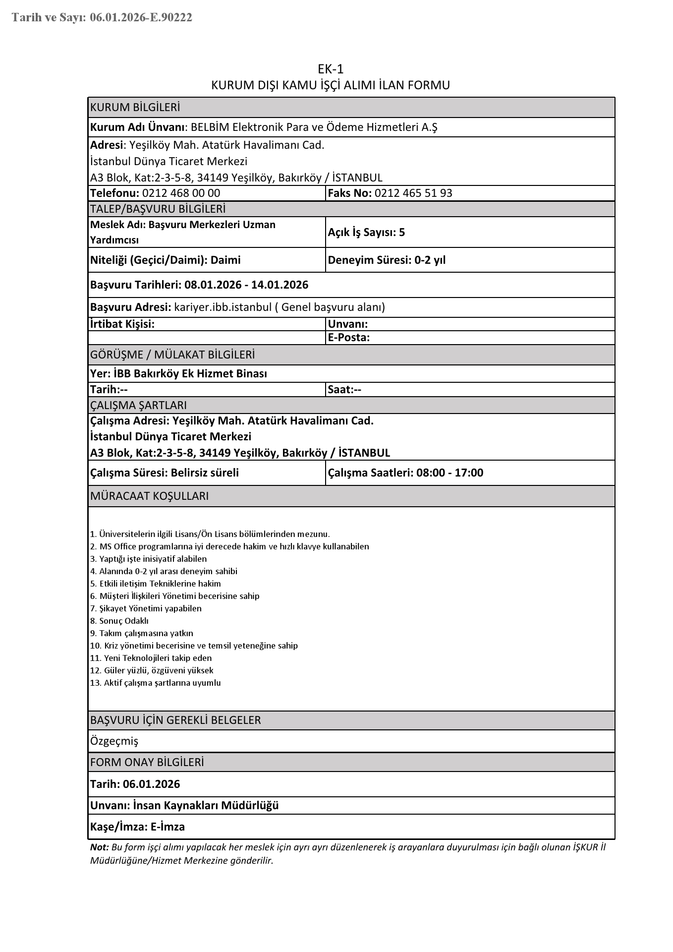 Ana sayfaDaimi İşçi İlanları İstanbul Belbim 5 İşçi Alacak İstanbul Belbim 5 İşçi Alacak. Son başvuru tarihi 14 Ocak 2026 Kaynak : İşkur İlan Giriş : 08 Ocak 2026 22:36, Son Güncelleme : 08 Ocak 2026 22:46 Yazdır Yorumlar (0) Abone Ol