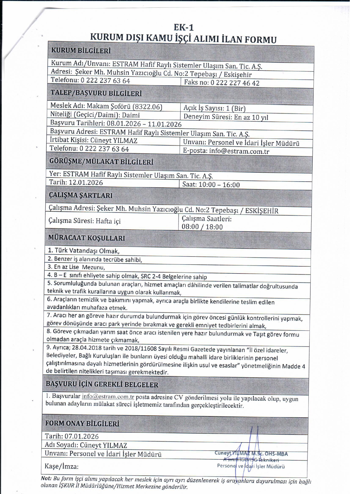 Ana sayfaDaimi İşçi İlanları Eskişehir Estram 1 İşçi Alacak Eskişehir Estram 1 İşçi Alacak. Son başvuru tarihi 11 Ocak 2026 Kaynak : İşkur İlan Giriş : 08 Ocak 2026 22:42, Son Güncelleme : 08 Ocak 2026 22:44 Yazdır Yorumlar (0) Abone Ol