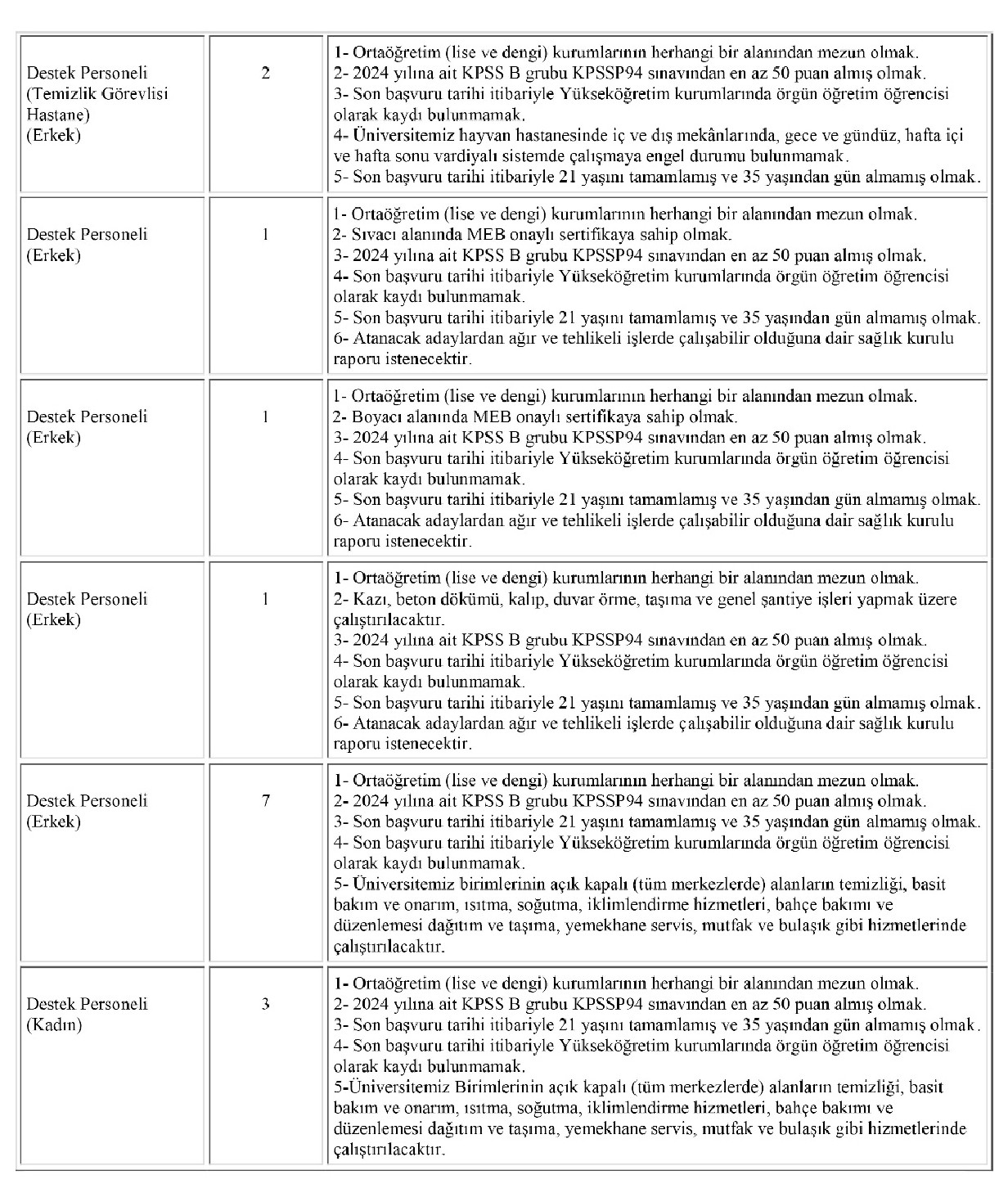 5. Tercih edilecek pozisyonun karşısında belirtilen öğrenim düzeyinden mezun olmak.