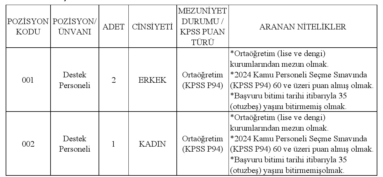 Üniversitemiz birimlerinde 657 sayılı Devlet Memurları Kanunu'nun 4'üncü maddesinin (B) fıkrası uyarınca istihdam edilmek üzere, 06.06.1978 tarihli ve 7/15754 sayılı Bakanlar Kurulu Kararı ile yürürlüğe konulan "Sözleşmeli Personel Çalıştırılmasına İlişkin Esaslar"da yer alan Ek 2 nci maddenin (b) fıkrası gereğince "yazılı ve/veya sözlü sınav yapılmaksızın, Ortaöğretim 2024 KPSS (B) grubu puan sıralaması esas alınmak suretiyle" aşağıda belirtilen pozisyonlara sözleşmeli personel alınacaktır.