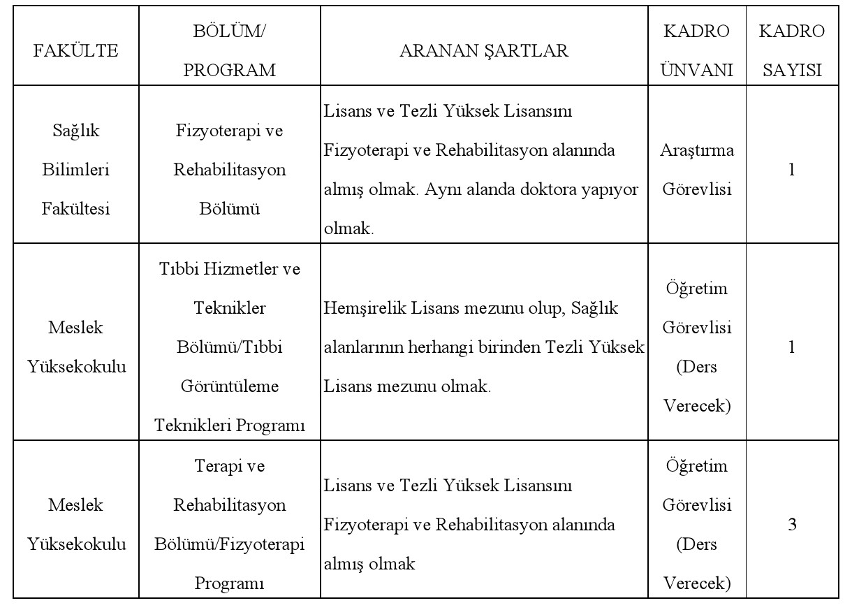 Üniversitemiz, 2547 sayılı Yükseköğretim Kanununun ilgili maddeleri ile Öğretim Üyesi Dışındaki Öğretim Elemanı Kadrolarına Yapılacak Atamalarda Uygulanacak Merkezi Sınav ile Giriş Sınavlarına İlişkin Usul ve Esaslar Hakkında Yönetmeliğin ilgili maddelerine göre öğretim elemanı alınacaktır.
