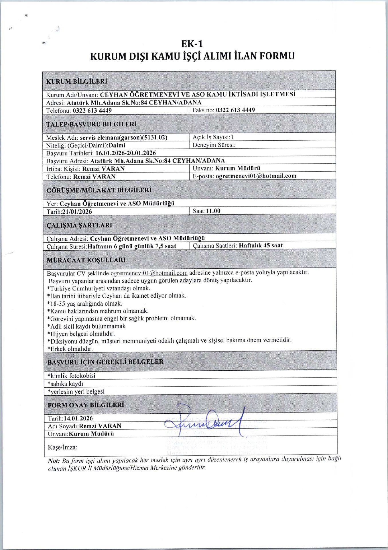 Ana sayfaDaimi İşçi İlanları Adana Ceyhan Öğretmenevi 1 İşçi Alacak Adana Ceyhan Öğretmenevi 1 İşçi Alacak. Son başvuru tarihi 20 Ocak 2026 Kaynak : İşkur İlan Giriş : 15 Ocak 2026 21:29, Son Güncelleme : 15 Ocak 2026 23:25 Yazdır Yorumlar (0) Abone Ol