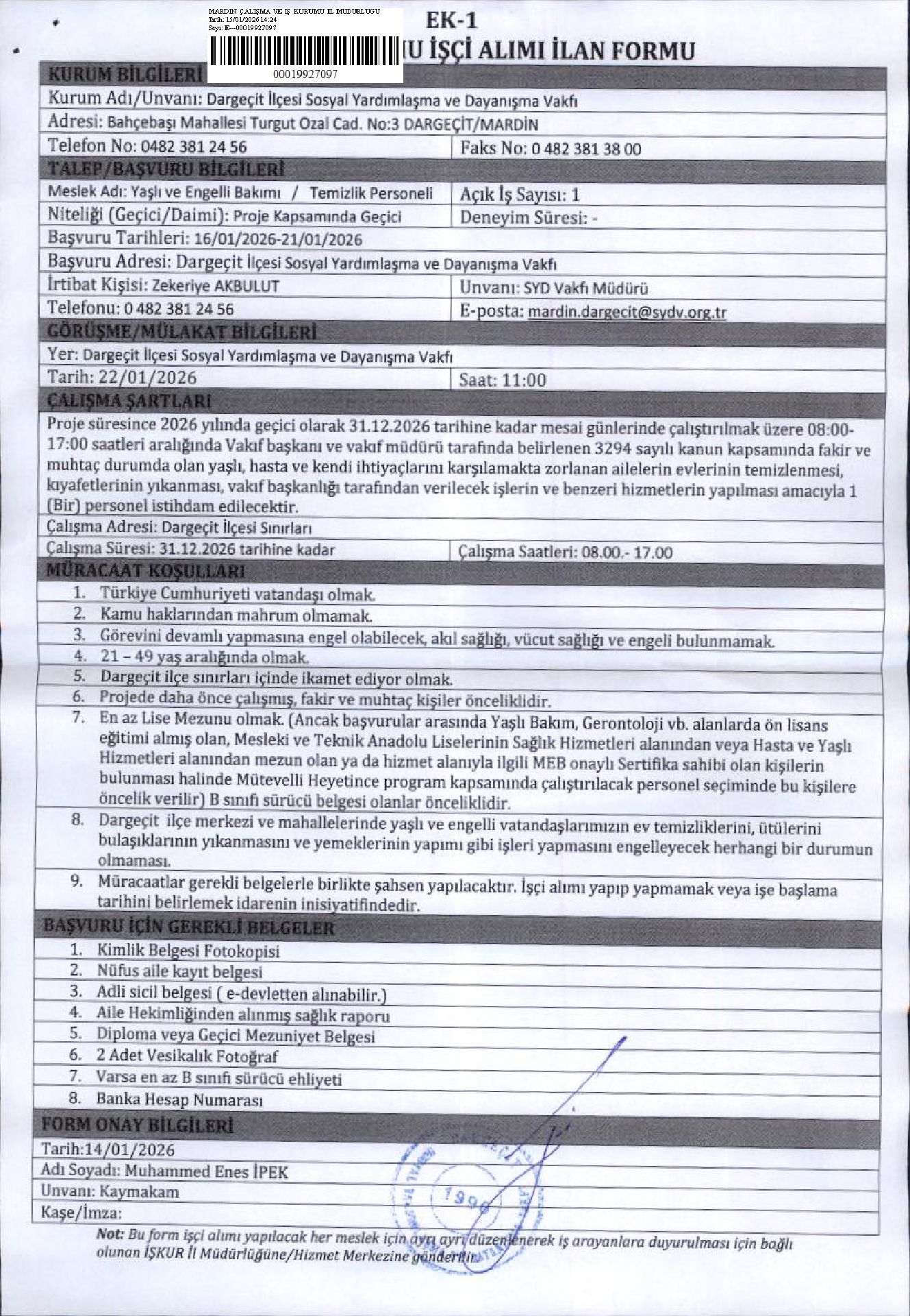Ana sayfaSYDV İlanlarıAna sayfaGeçici İşçi İlanları Mardin Dargeçit SYDV Geçici 1 İşçi Alacak Mardin Dargeçit SYDV Geçici 1 İşçi Alacak. Son başvuru tarihi 21 Ocak 2026 Kaynak : İşkur İlan Giriş : 15 Ocak 2026 21:38, Son Güncelleme : 15 Ocak 2026 23:22 Yazdır Yorumlar (0) Abone Ol