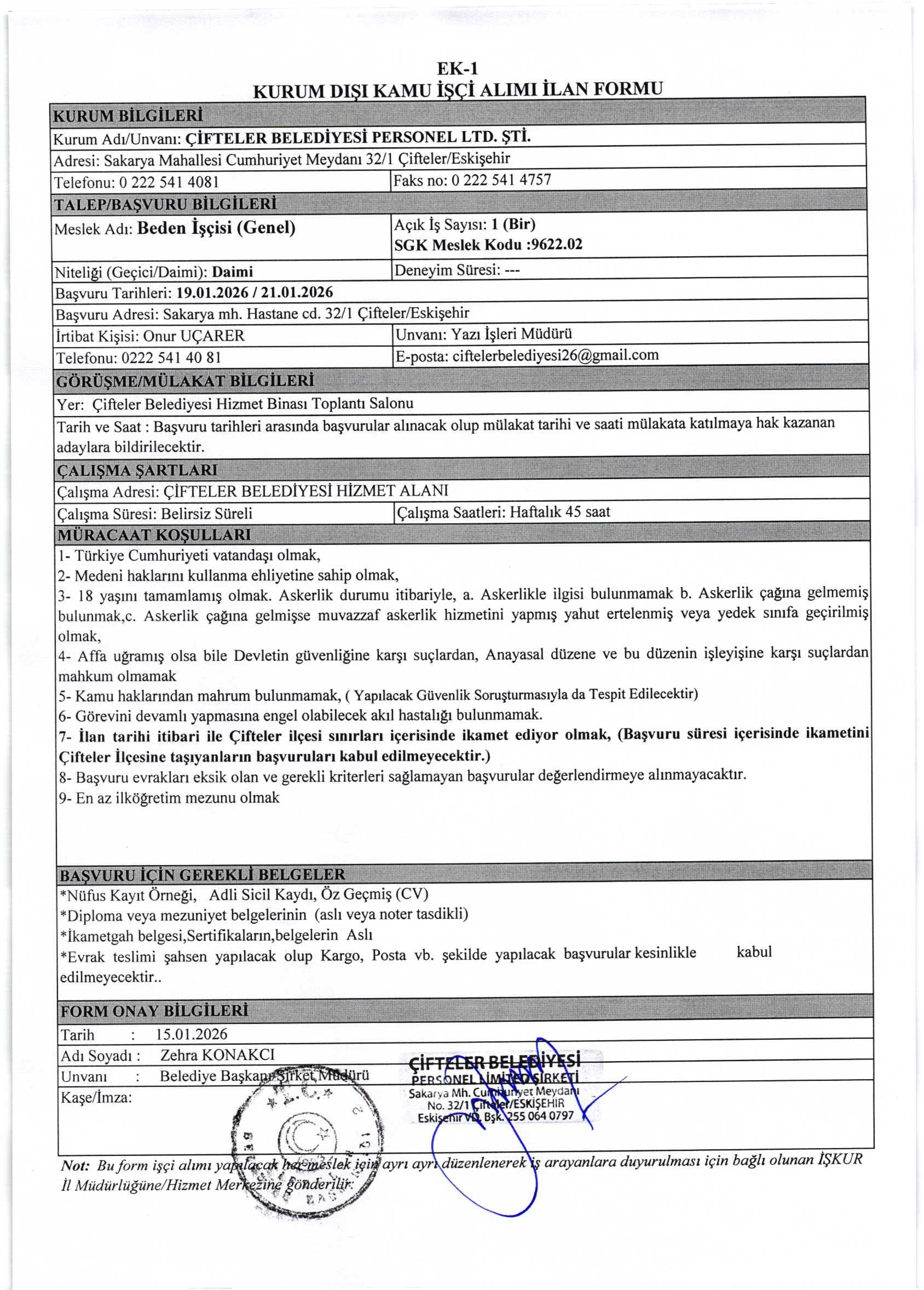 Ana sayfaDaimi İşçi İlanları Eskişehir Çifteler Belediyesi 1 İşçi Alacak Eskişehir Çifteler Belediyesi 1 İşçi Alacak. Son başvuru tarihi 21 Ocak 2026 Kaynak : İşkur İlan Giriş : 16 Ocak 2026 23:23, Son Güncelleme : 17 Ocak 2026 01:04 Yazdır Yorumlar (0) Abone Ol