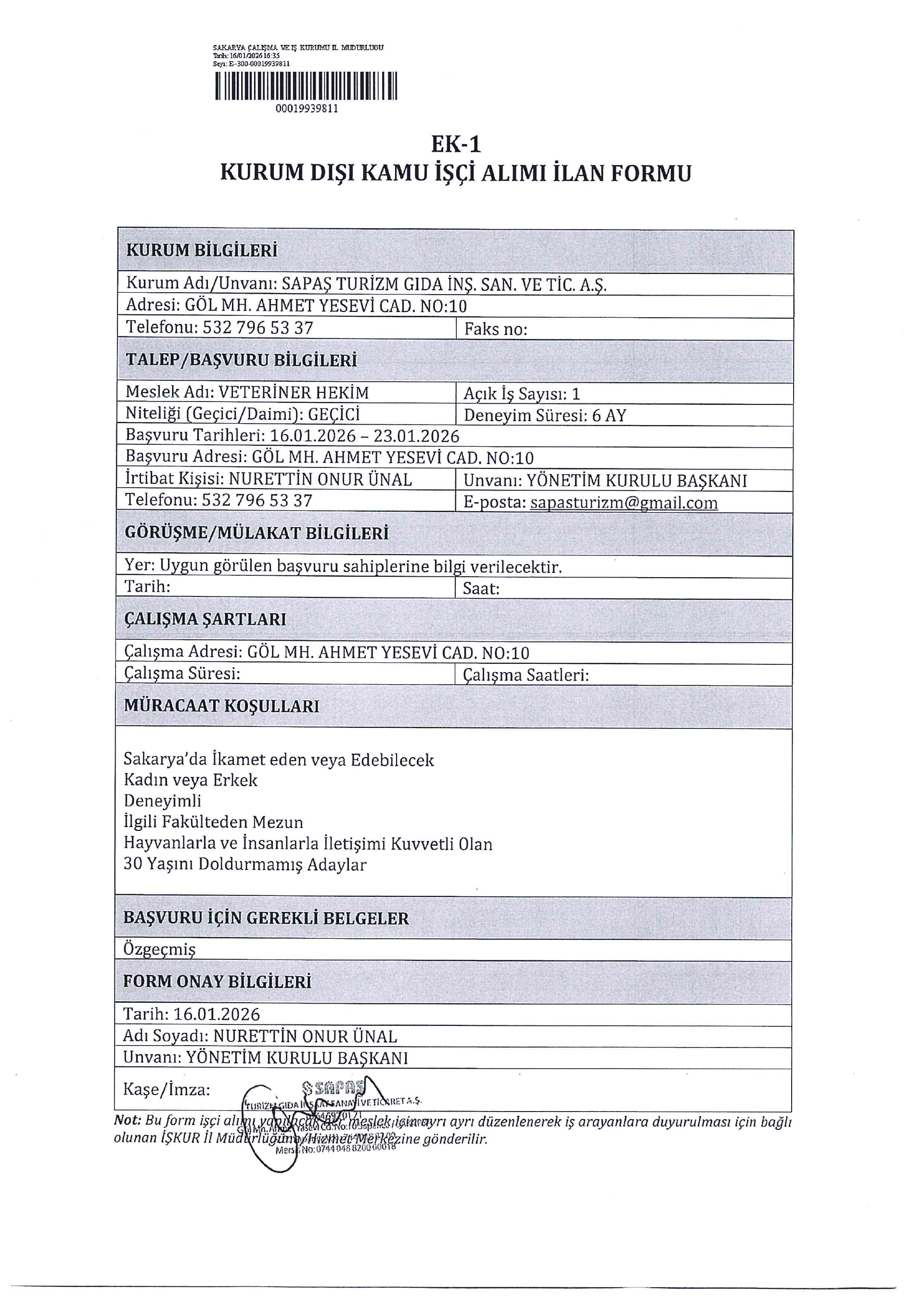 Ana sayfaGeçici İşçi İlanları Sakarya Sapaş Turizm Geçici 1 İşçi Alacak Sakarya Sapaş Turizm Geçici 1 İşçi Alacak. Son başvuru tarihi 23 Ocak 2026 Kaynak : İşkur İlan Giriş : 16 Ocak 2026 23:47, Son Güncelleme : 17 Ocak 2026 00:57 Yazdır Yorumlar (0) Abone Ol