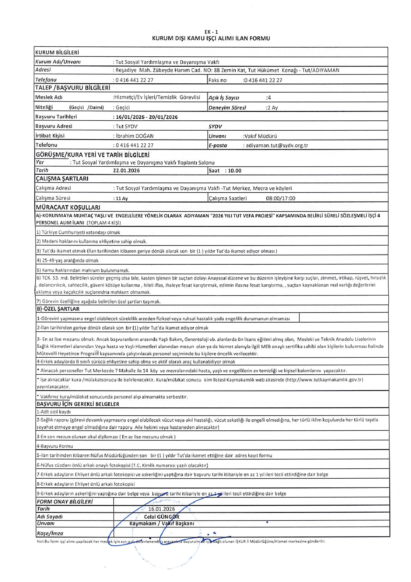Adıyaman Tut SYDV Geçici 4 İşçi Alacak. Son başvuru tarihi 20 Ocak 2026