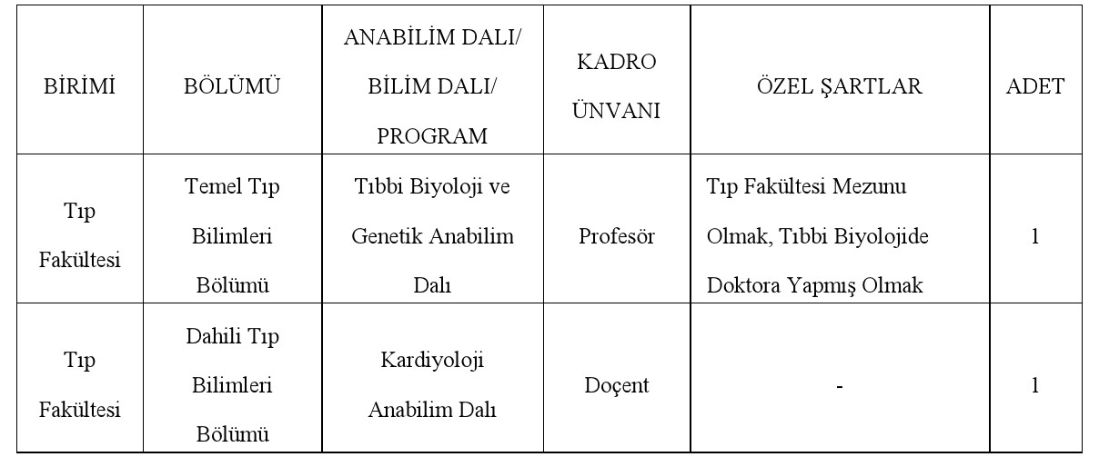 Üniversitemizin aşağıda belirtilen birimlerine 2547 sayılı Yükseköğretim Kanunu ile Öğretim Üyeliğine Yükseltilme ve Atanma Yönetmeliğinin ilgili maddeleri uyarınca, Üniversitemiz Öğretim Üyeliğine Yükseltme ve Atama Kriterlerini sağlamış olmak koşuluyla Öğretim Üyeleri alınacaktır.