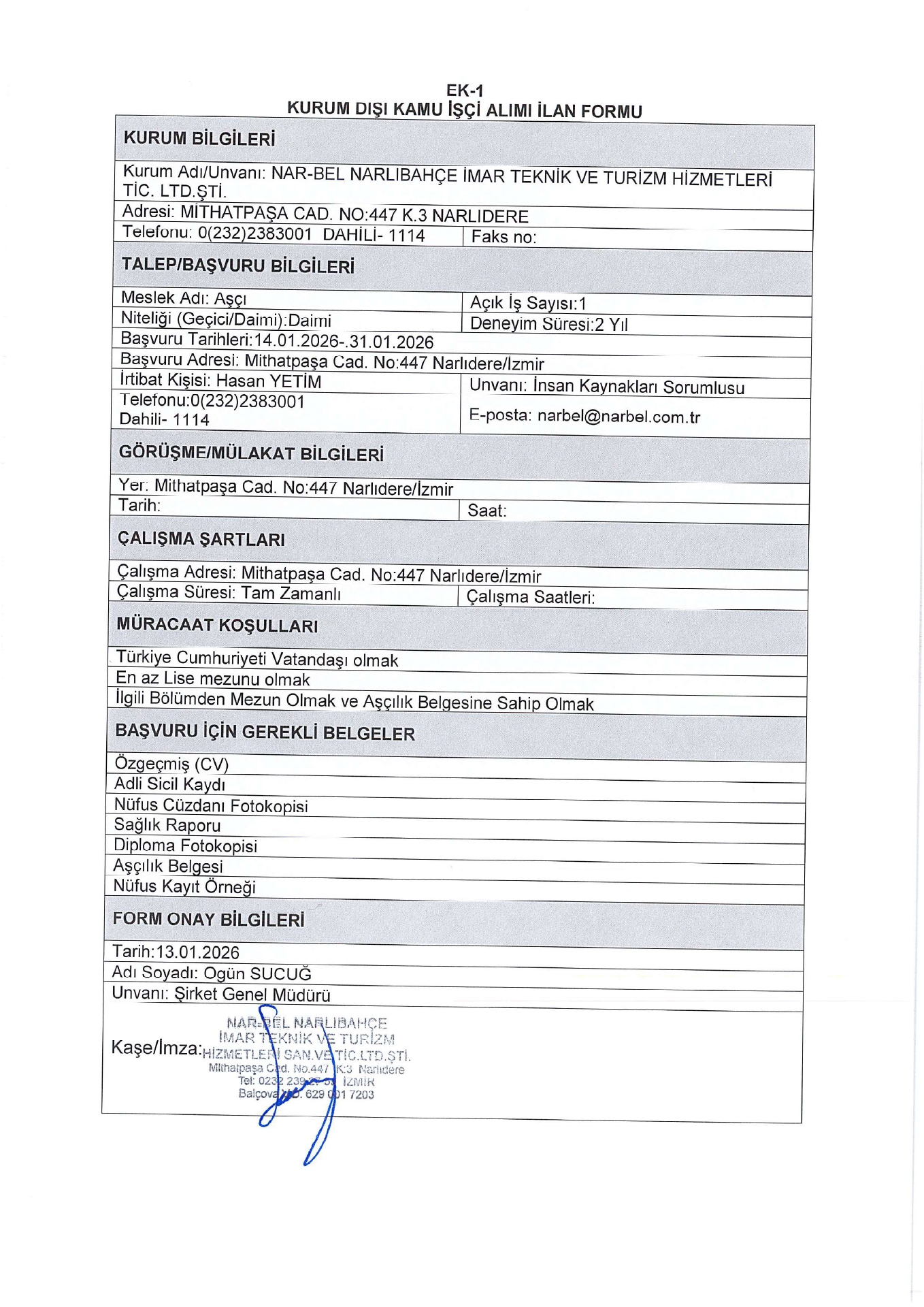 İzmir Nar-Bel Geçici 1 İşçi Alacak. Son başvuru tarihi 31 Ocak 2026