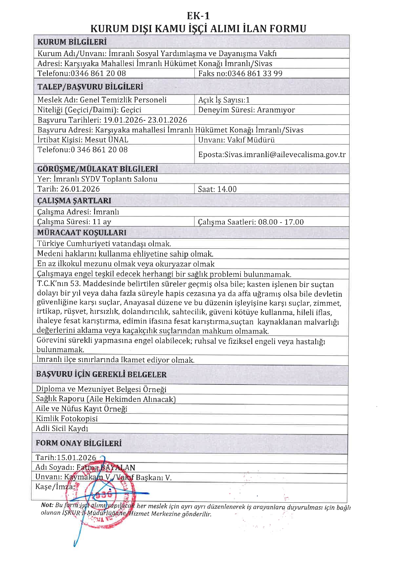 Ana sayfaSYDV İlanlarıAna sayfaGeçici İşçi İlanları Sivas İmralı SYDV Geçici 1 İşçi Alacak Sivas İmralı SYDV Geçici 1 İşçi Alacak. Son başvuru tarihi 23 Ocak 2026 Kaynak : İşkur İlan Giriş : 19 Ocak 2026 23:33, Son Güncelleme : 19 Ocak 2026 23:37 Yazdır Yorumlar (0) Abone Ol