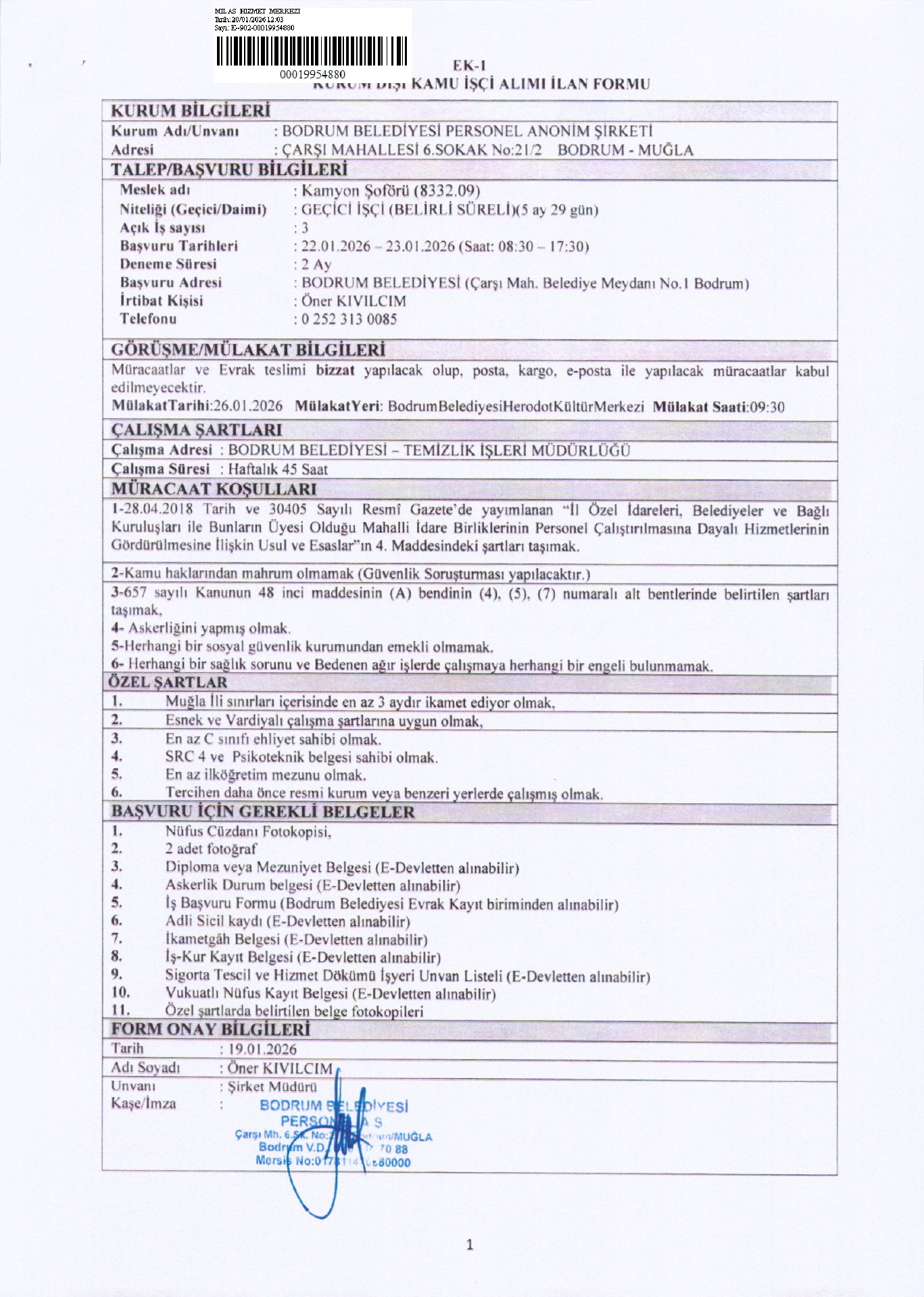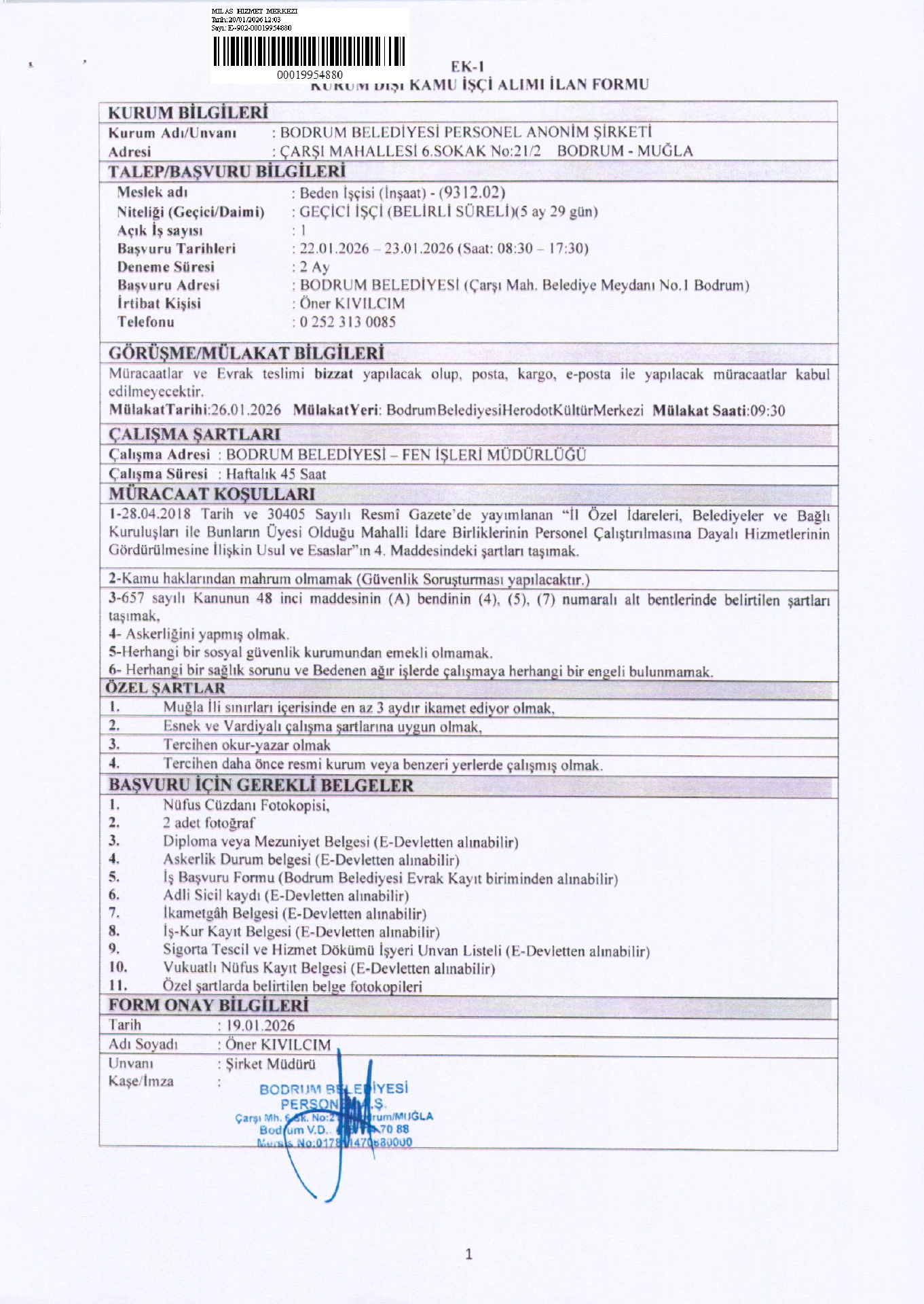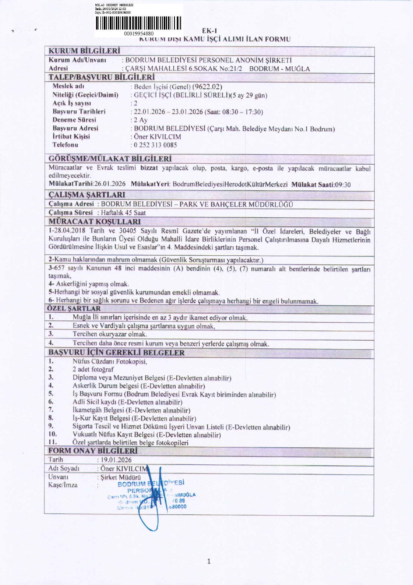 Ana sayfaGeçici İşçi İlanları Muğla Bodrum Belediyesi Geçici 18 İşçi Alacak Muğla Bodrum Belediyesi Geçici 18 İşçi Alacak. Son başvuru tarihi 23 Ocak 2026 Kaynak : İşkur İlan Giriş : 21 Ocak 2026 00:13, Son Güncelleme : 21 Ocak 2026 00:44 Yazdır Yorumlar (0) Abone Ol