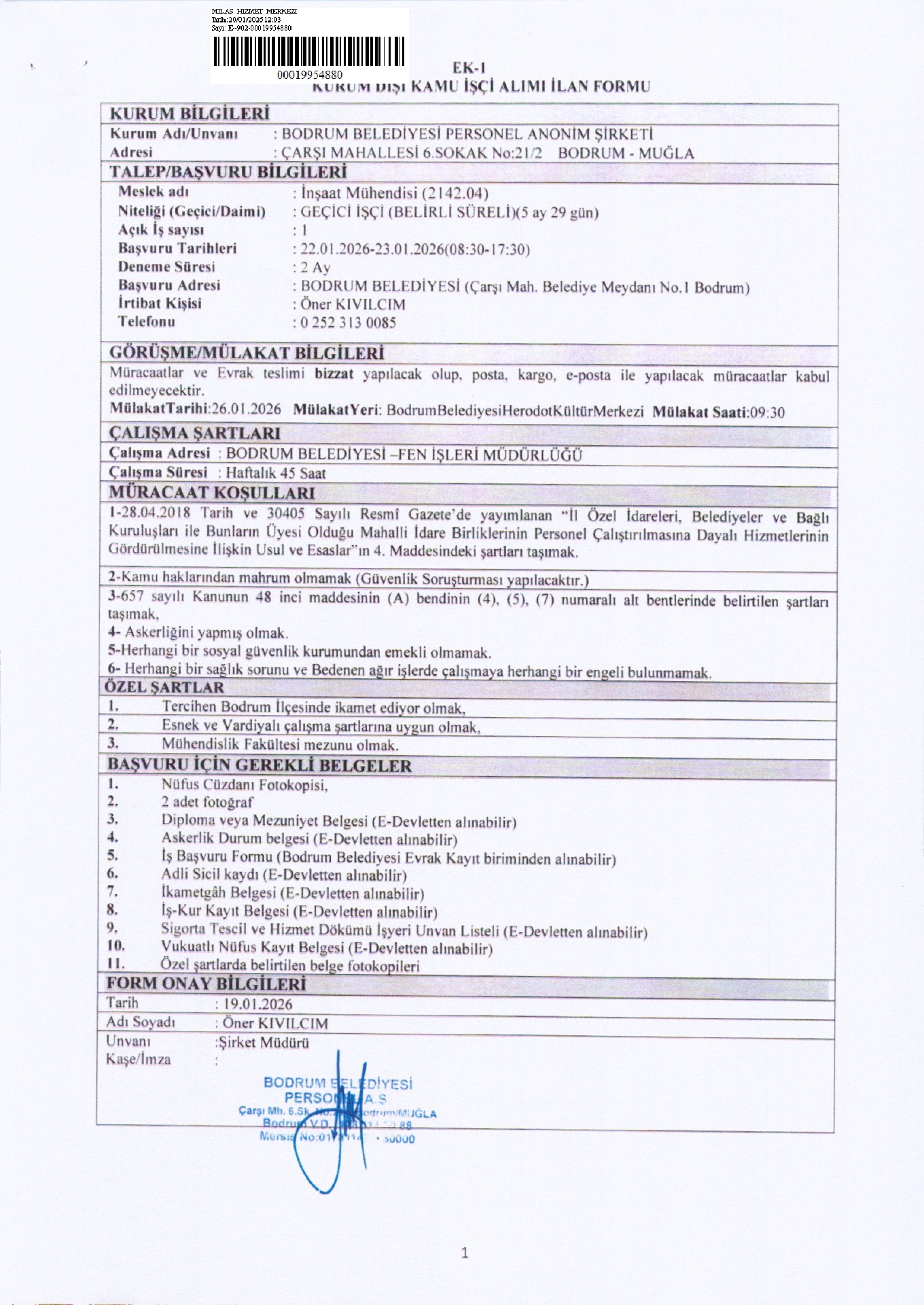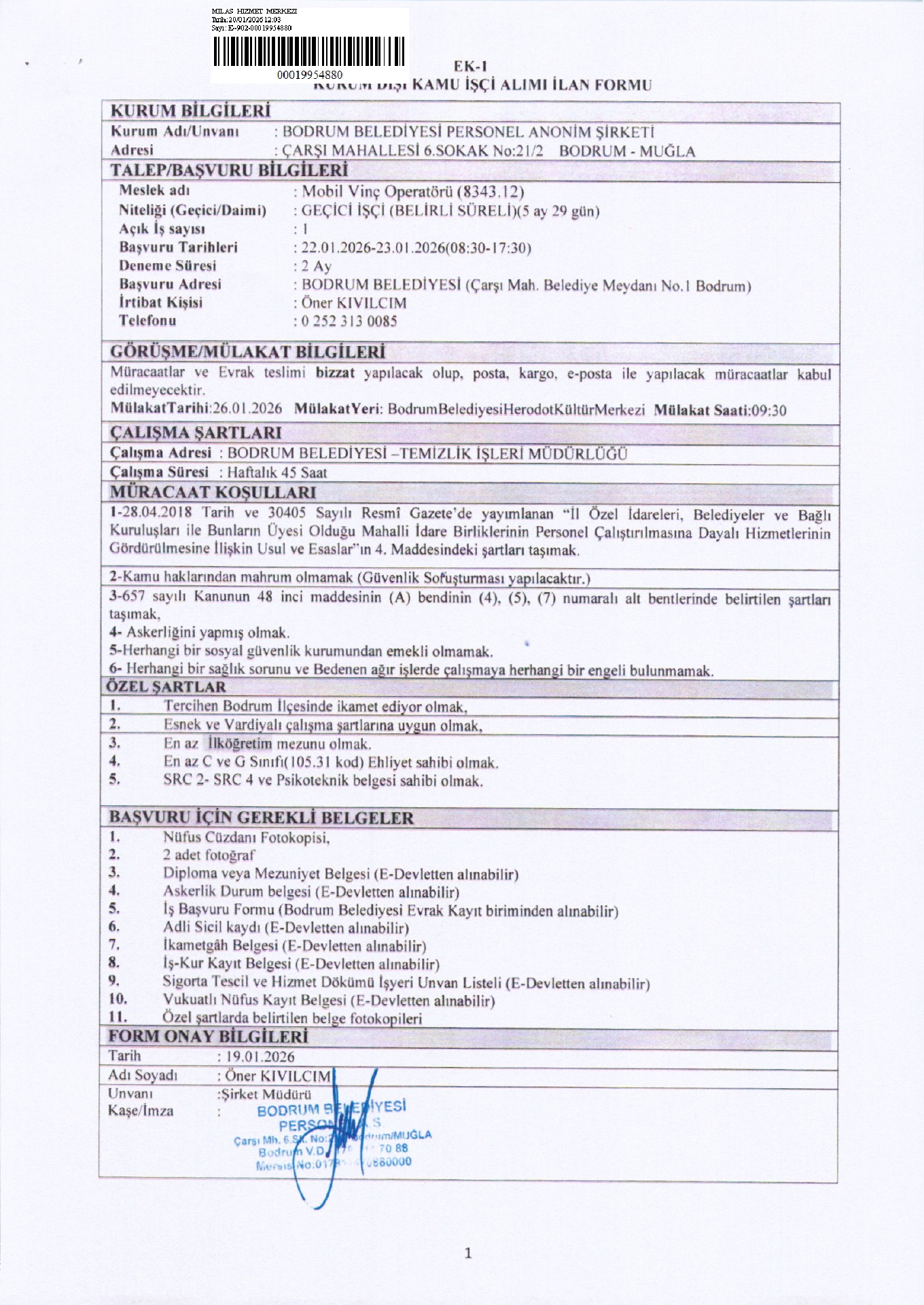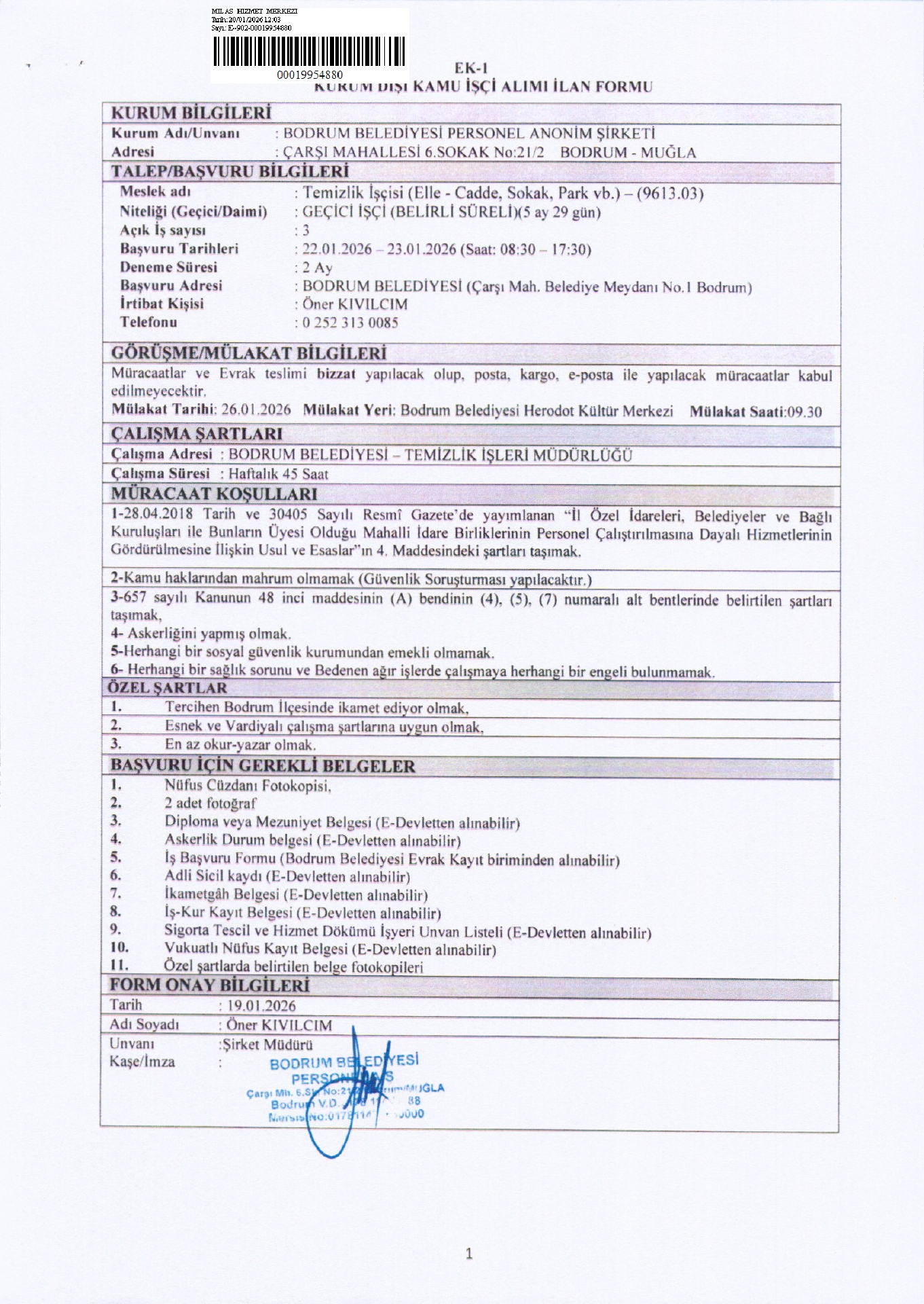 Ana sayfaGeçici İşçi İlanları Muğla Bodrum Belediyesi Geçici 18 İşçi Alacak Muğla Bodrum Belediyesi Geçici 18 İşçi Alacak. Son başvuru tarihi 23 Ocak 2026 Kaynak : İşkur İlan Giriş : 21 Ocak 2026 00:13, Son Güncelleme : 21 Ocak 2026 00:44 Yazdır Yorumlar (0) Abone Ol