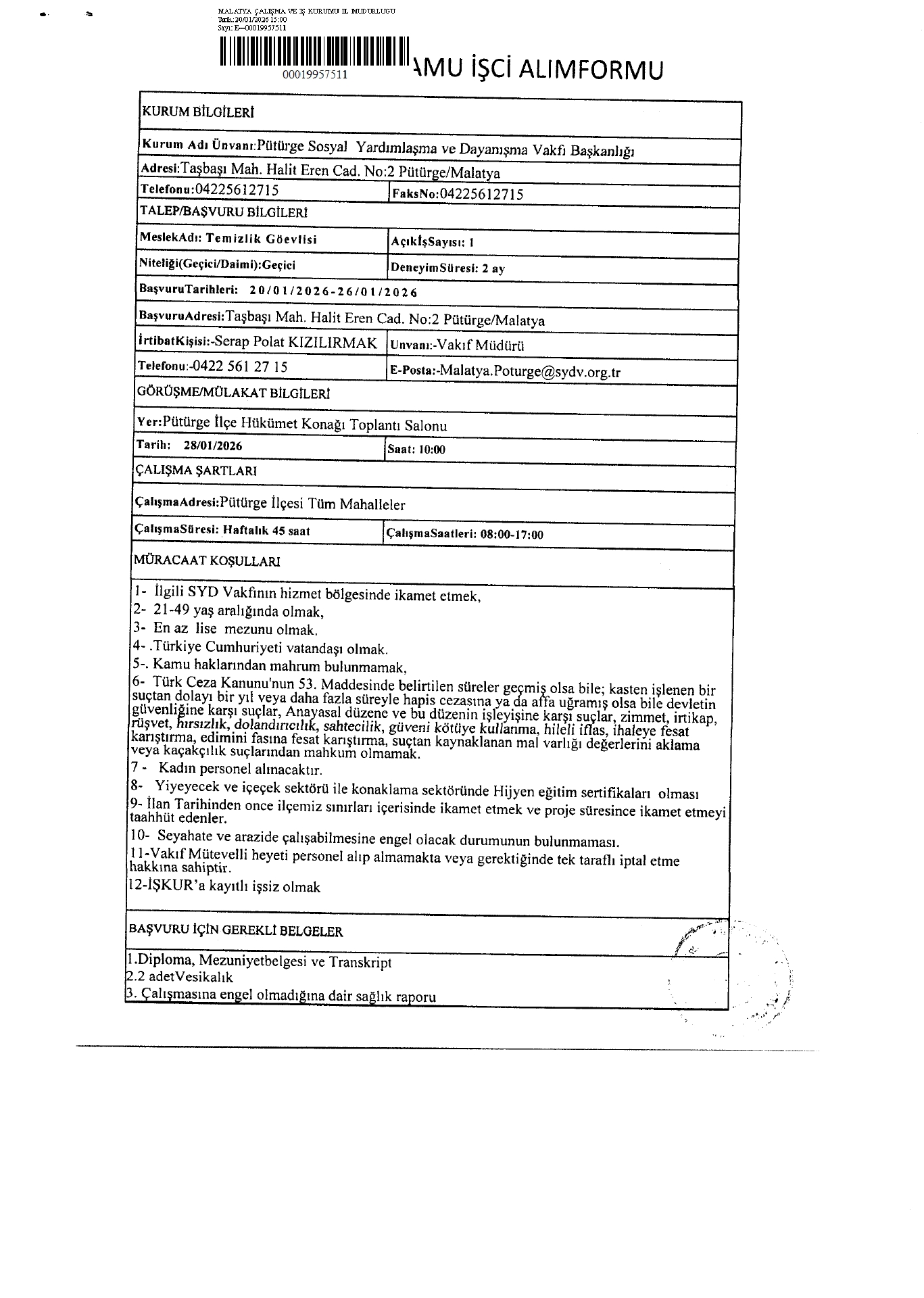 Ana sayfaSYDV İlanlarıAna sayfaGeçici İşçi İlanları Malatya Pütürge SYDV Geçici 1 İşçi Alacak Malatya Pütürge SYDV Geçici 1 İşçi Alacak. Son başvuru tarihi 28 Ocak 2026 Kaynak : İşkur İlan Giriş : 21 Ocak 2026 00:16, Son Güncelleme : 21 Ocak 2026 00:42 Yazdır Yorumlar (0) Abone Ol