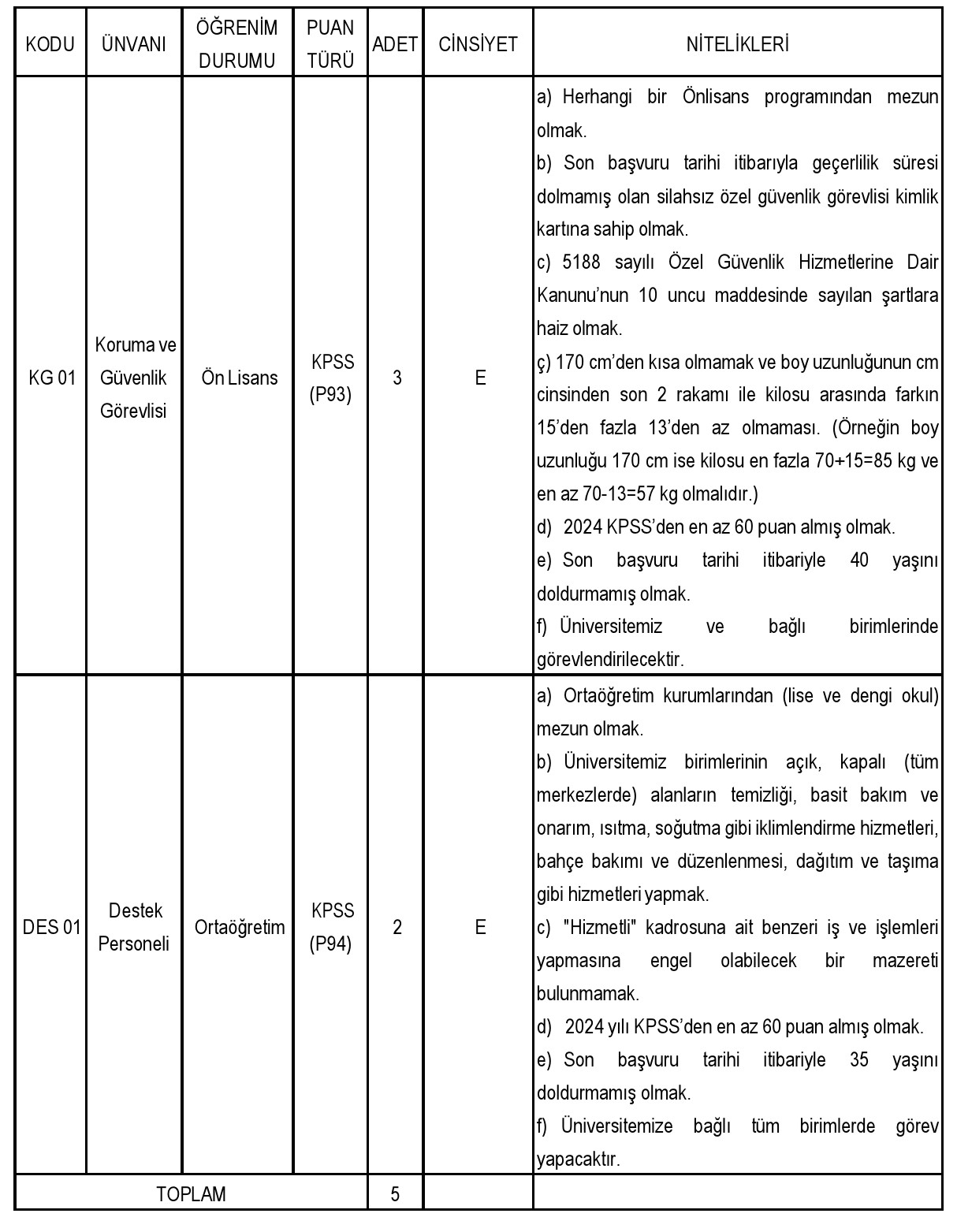 Üniversitemizde istihdam edilmek ve giderleri Özel Bütçeden karşılanmak suretiyle; 657 sayılı Devlet Memurları Kanunu'nun 4. maddesinin (B) fıkrasına göre tam zamanlı olarak çalıştırılmak üzere 28.06.2007 tarihli ve 26566 sayılı Resmi Gazete' de yayımlanan Sözleşmeli Personel Çalıştırılmasına İlişkin Esaslarda Değişiklik Yapılmasına Dair Esaslarda yer alan Ek 2. maddesinin (b) fıkrasına göre KPSS (B) grubu puan sırası esas alınmak suretiyle aşağıda belirtilen unvan ve nitelikle sözleşmeli personel alımı yapılacaktır.