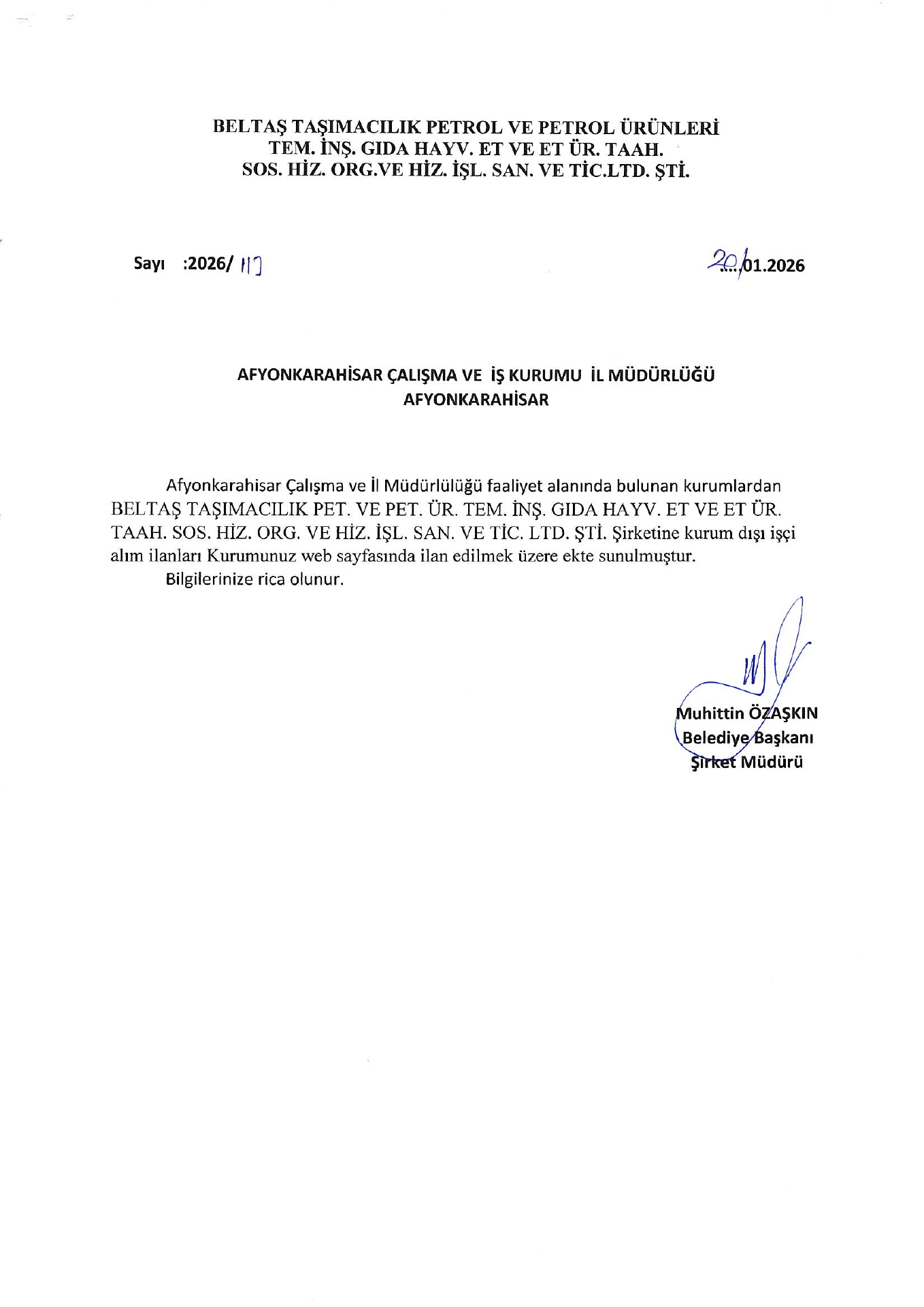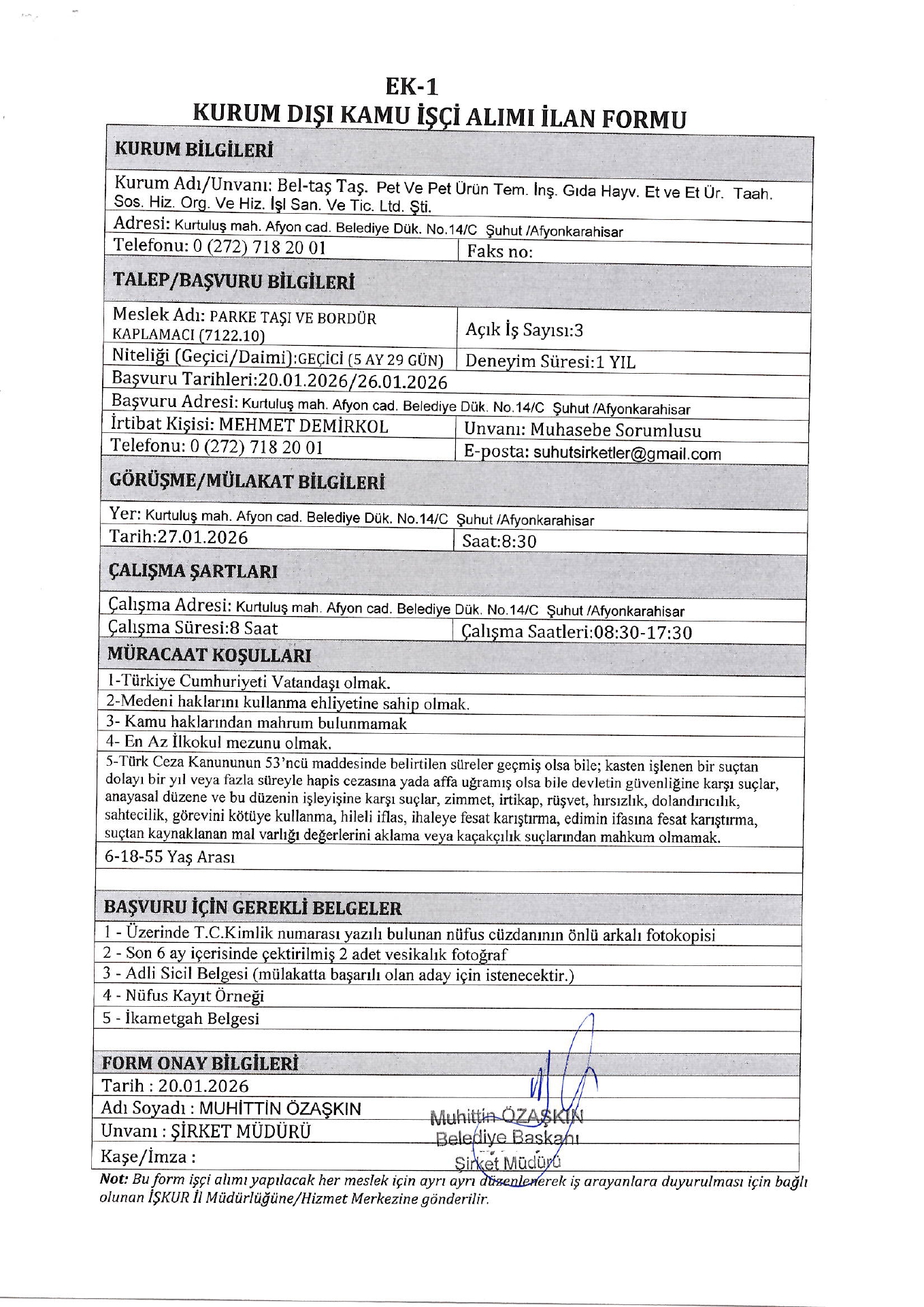 Afyonkarahisar Beltaş Geçici 3 İşçi Alacak. Son başvuru tarihi 26 Ocak 2026