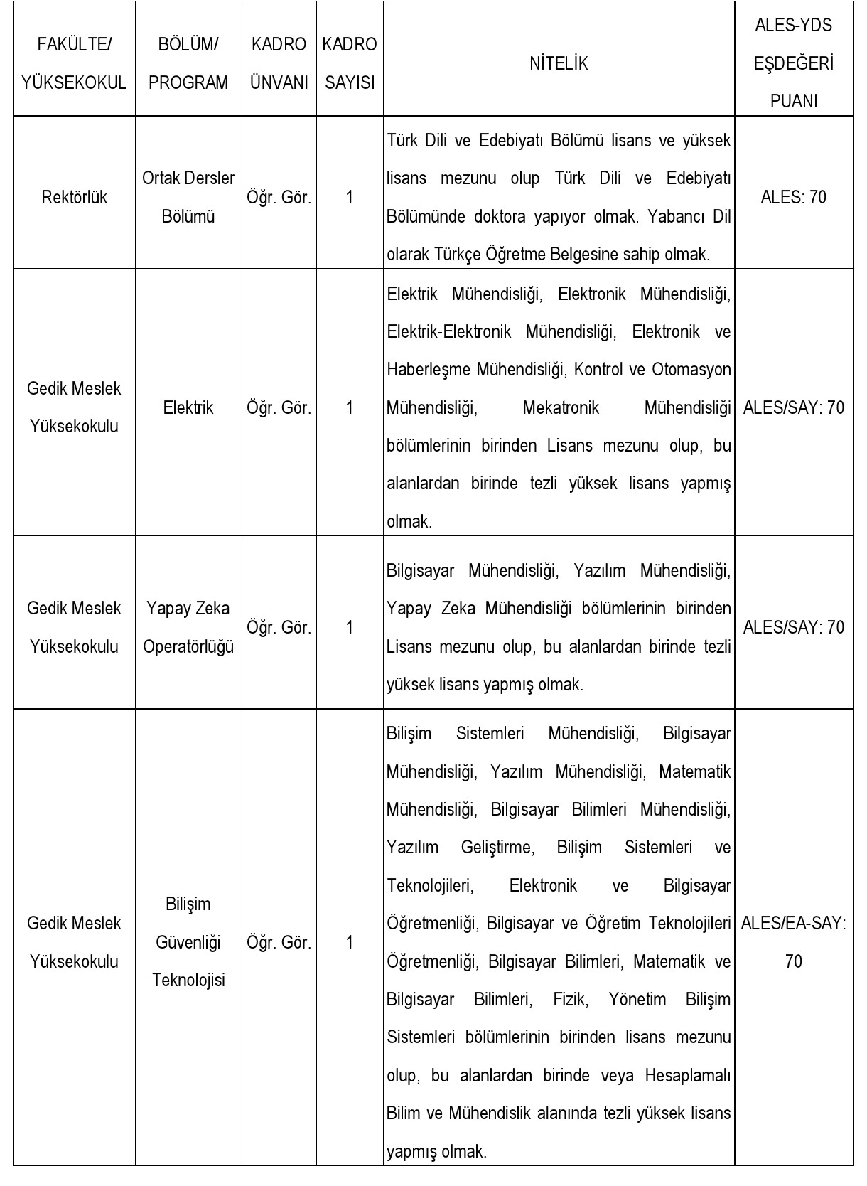 Üniversitemize 2547 sayılı Yükseköğretim Kanunu'nun ve Öğretim Üyesi Dışındaki Öğretim Elemanı Kadrolarına Yapılacak Atamalarda uygulanacak Merkezi Sınav ile Giriş Sınavlarına İlişkin Usul ve Esaslar Hakkında Yönetmelik gereğince öngörülen koşulları sağlamış olmak şartı ile aşağıda belirtilen kadrolara öğretim elemanı alınacaktır.