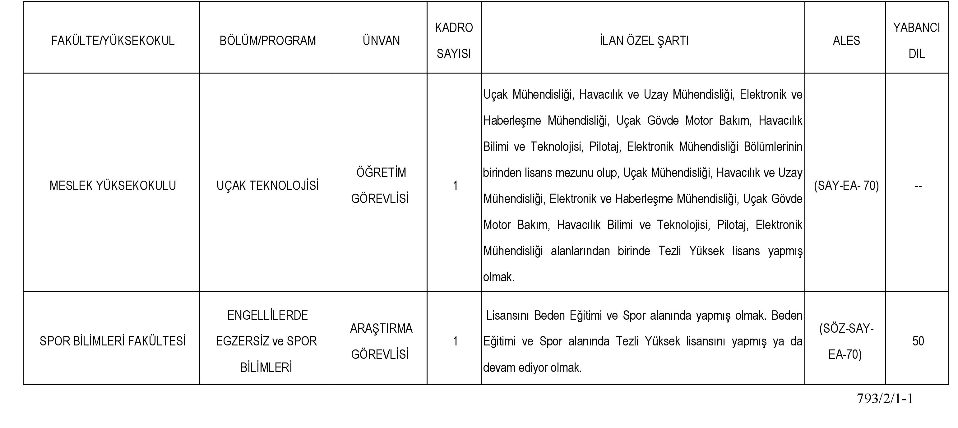Üniversitemizin aşağıda belirtilen Fakülte Bölümleri için 2547 sayılı Yükseköğretim Kanunu ve "Öğretim Üyesi Dışındaki Öğretim Elemanı Kadrolarına Yapılacak Atamalarda Uygulanacak Merkezi Sınav ile Giriş Sınavlarına İlişkin Usul ve Esaslar Hakkında Yönetmelik" ilgili maddelerine göre Öğretim Elemanı kadrolarına Personel alımı yapılacaktır.