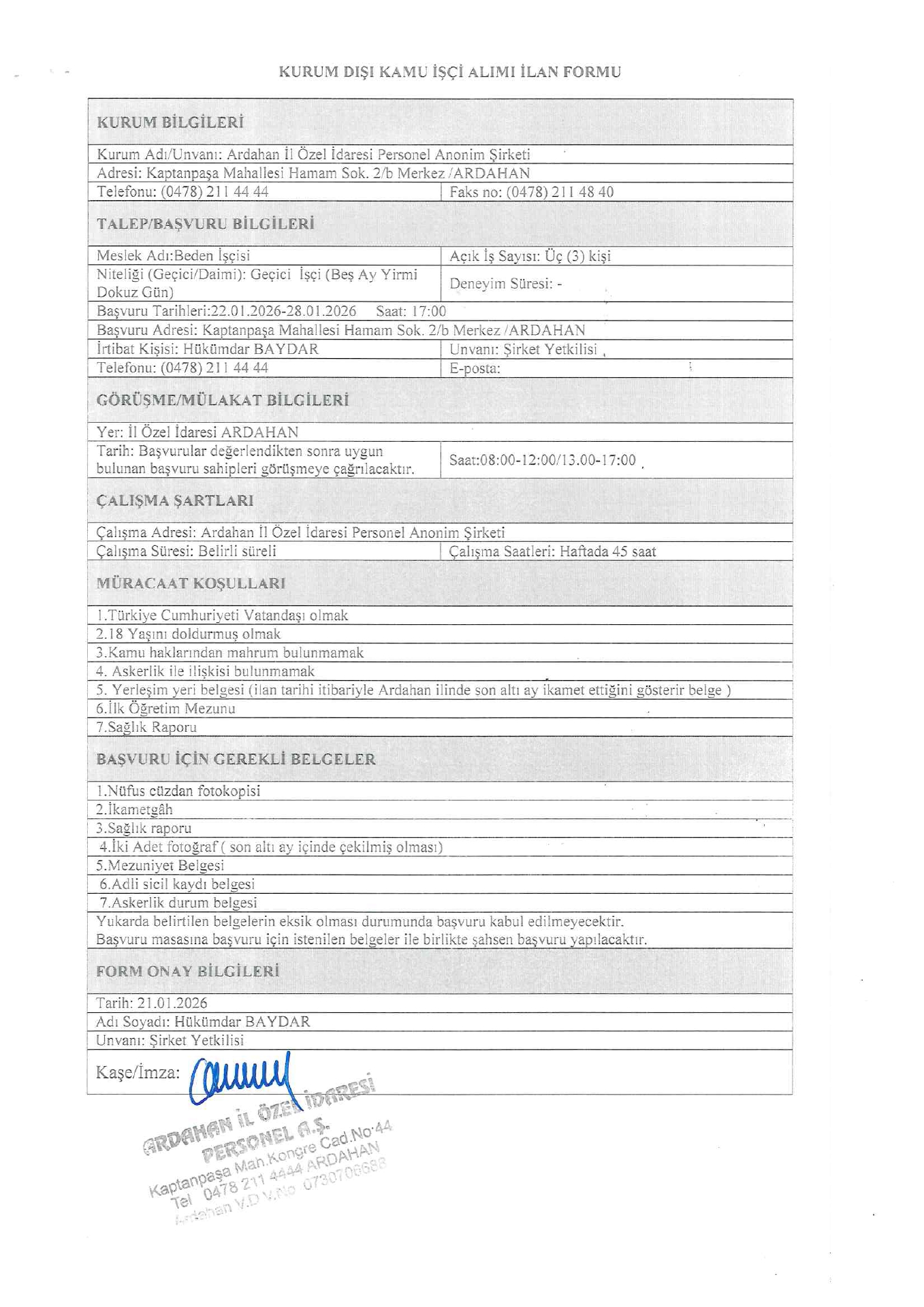 Ana sayfaGeçici İşçi İlanları Ardahan İl Özel İdaresi Geçici 3 İşçi Alacak Ardahan İl Özel İdaresi Geçici 3 İşçi Alacak. Son başvuru tarihi 28 Ocak 2026 Kaynak : İşkur İlan Giriş : 22 Ocak 2026 23:20, Son Güncelleme : 23 Ocak 2026 01:34 Yazdır Yorumlar (0) Abone Ol