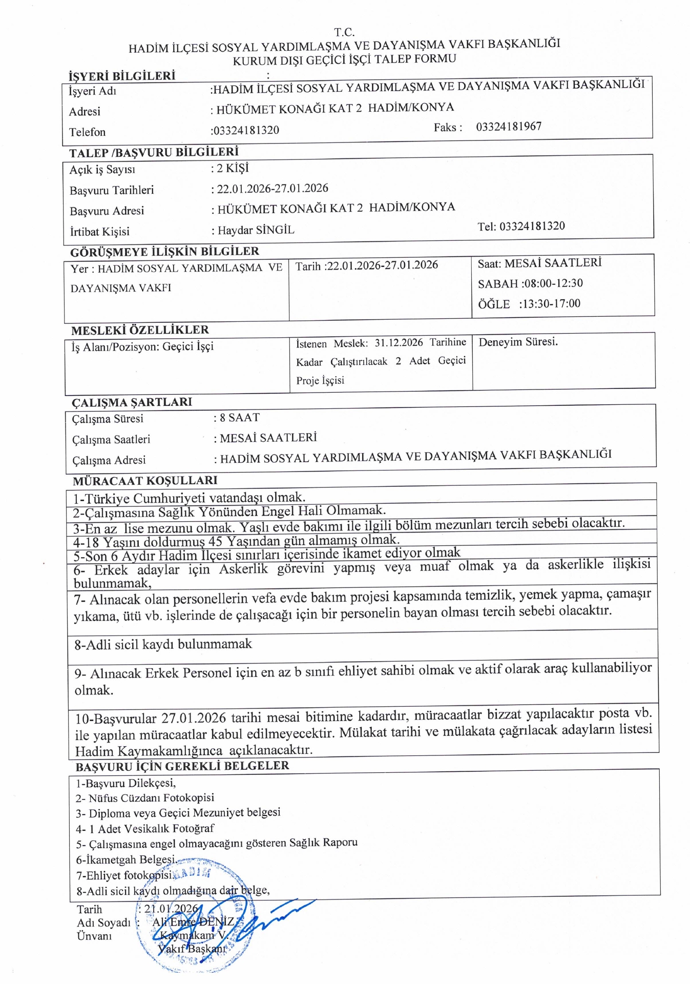 Ana sayfaSYDV İlanlarıAna sayfaGeçici İşçi İlanları Konya Hadim SYDV Geçici 2 İşçi Alacak Kaynak : İşkur İlan Giriş : 22 Ocak 2026 23:32, Son Güncelleme : 23 Ocak 2026 01:30 Yazdır Yorumlar (0) Abone Ol
