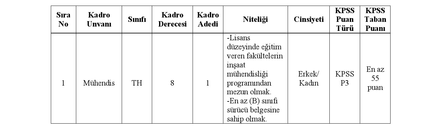 Tokat ili Başçiftlik Belediye Başkanlığı bünyesinde, 657 sayılı Devlet Memurları Kanununa tabi olarak istihdam edilmek üzere; Mahalli İdarelere İlk Defa Atanacaklara Dair Sınav ve Atama Yönetmeliği hükümlerine göre aşağıda unvanı, sınıfı, derecesi, adedi, nitelikleri, KPSS puan türü, KPSS taban puanı ve diğer şartları taşımak kaydıyla belirtilen boş kadroya açıktan atama yoluyla memur alınacaktır.