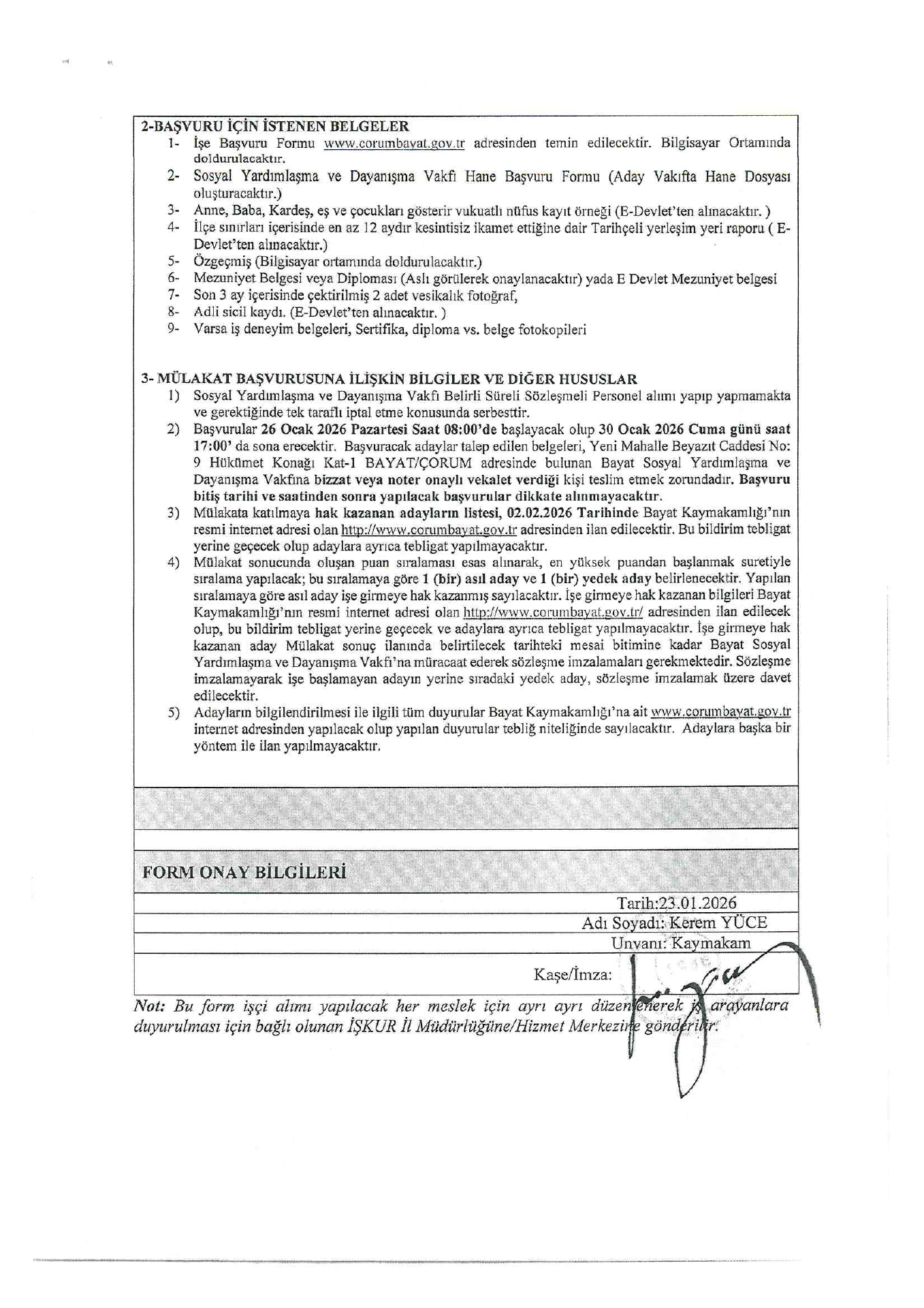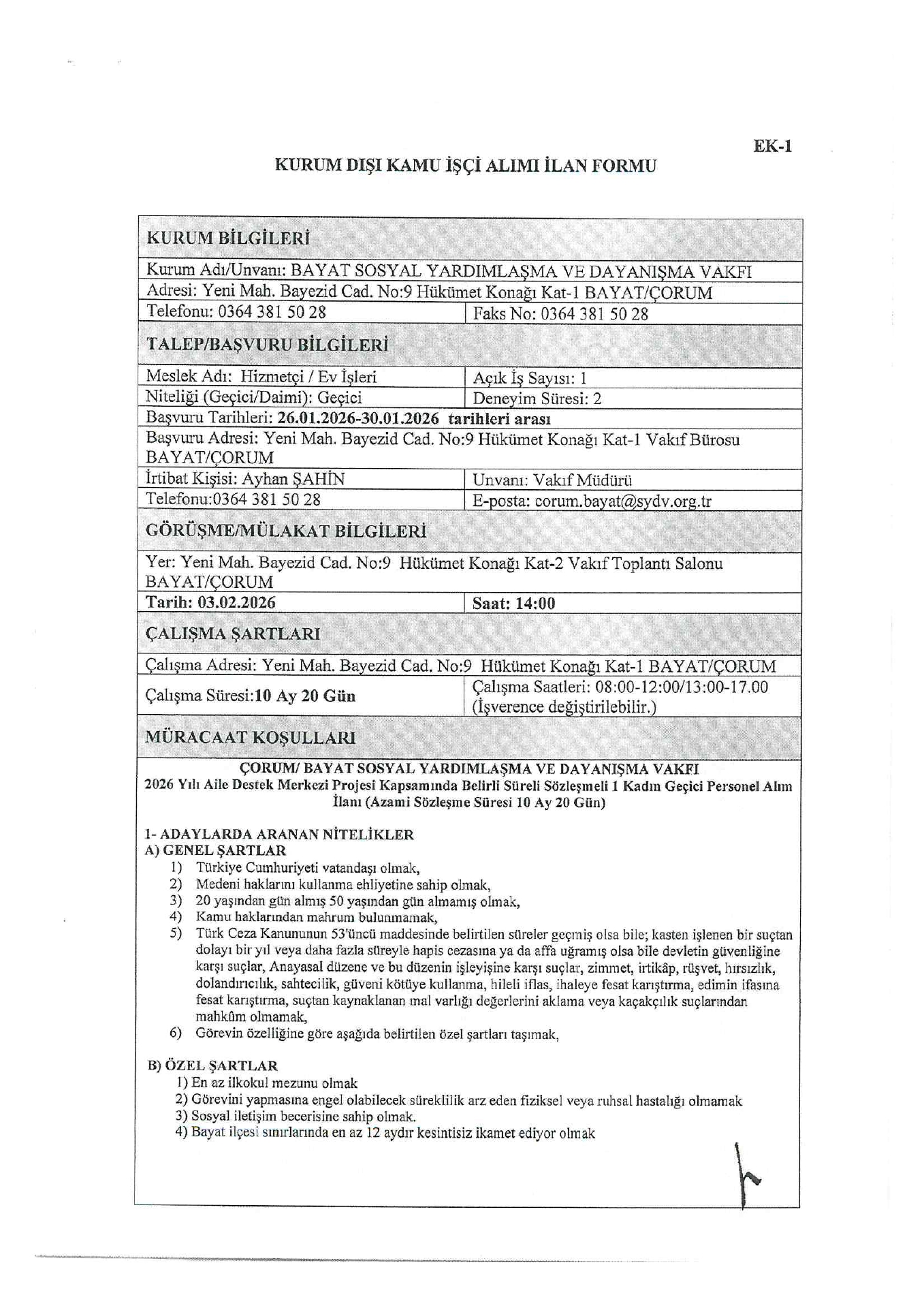 Çorum Bayat SYDV Geçici 1 İşçi Alacak. Son başvuru tarihi 30 Ocak 2026