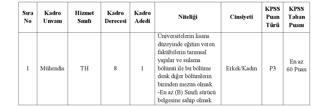 Ağrı ili Eleşkirt Belediye Başkanlığı bünyesinde, 657 sayılı Devlet Memurları Kanununa tabi olarak istihdam edilmek üzere; Mahalli İdarelere İlk Defa Atanacaklara Dair Sınav ve Atama Yönetmeliği hükümlerine göre aşağıda unvanı, sınıfı, derecesi, adedi, nitelikleri, KPSS puan türü, KPSS taban puanı ve diğer şartları taşımak kaydıyla belirtilen boş kadrolara açıktan atama yoluyla memur alınacaktır.