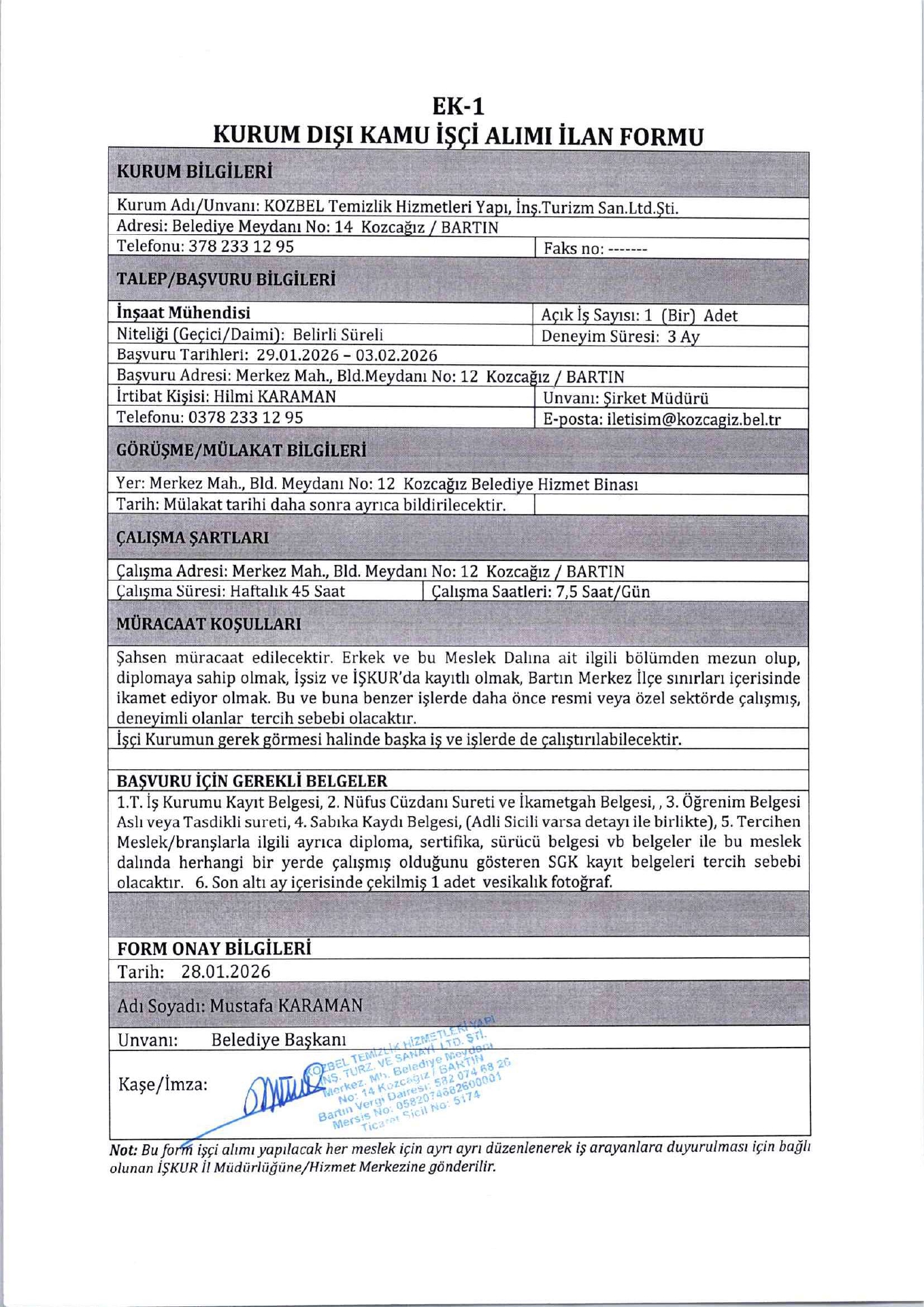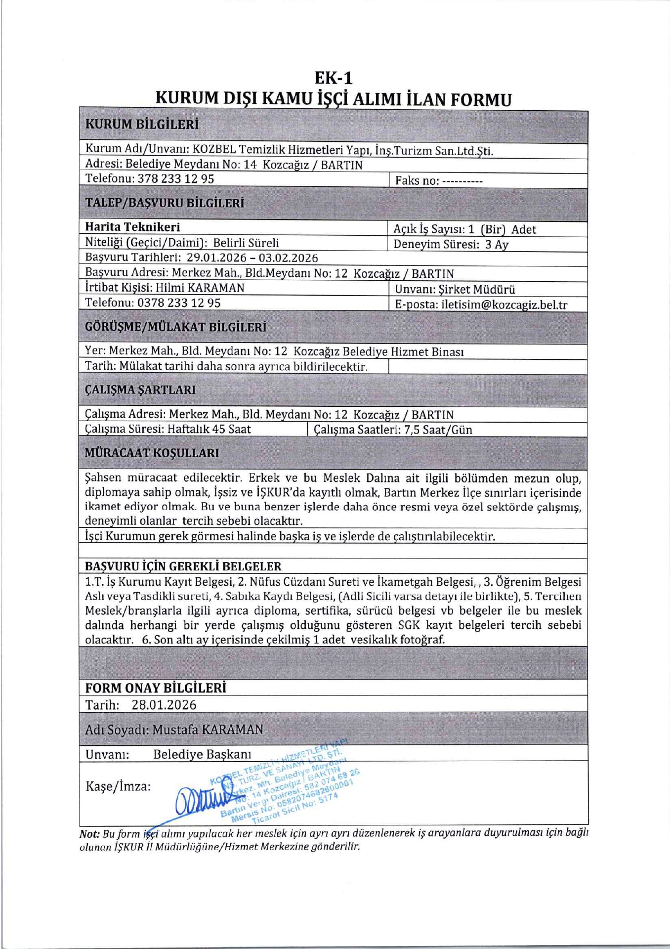 Ana sayfaGeçici İşçi İlanları Bartın Kozbel Temizlik 2 İşçi Alacak Bartın Kozbel Temizlik 2 İşçi Alacak. Son başvuru tarihi 3 Şubat 2026 Kaynak : İşkur İlan Giriş : 30 Ocak 2026 23:46, Son Güncelleme : 31 Ocak 2026 01:43 Yazdır Yorumlar (0) Abone Ol
