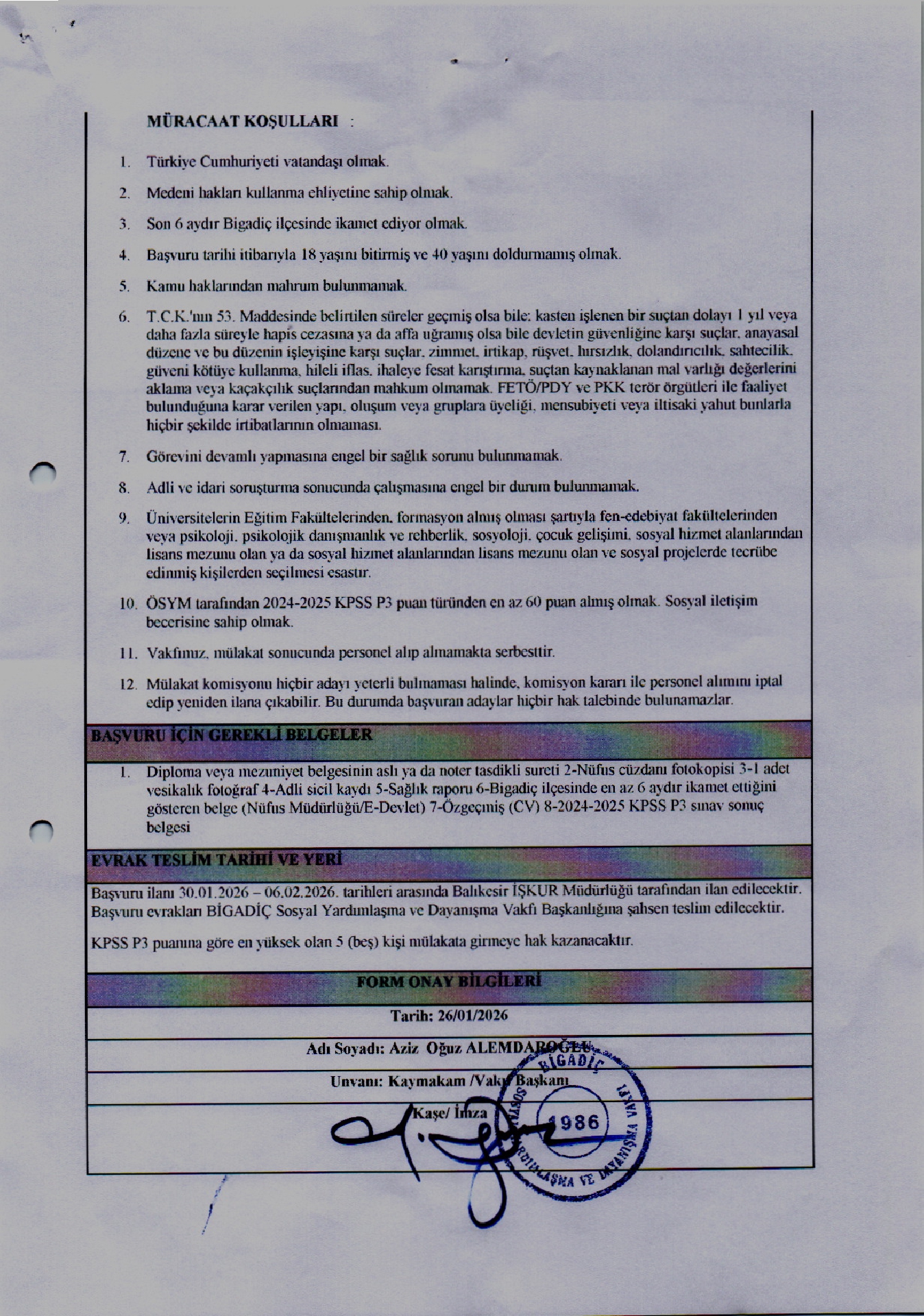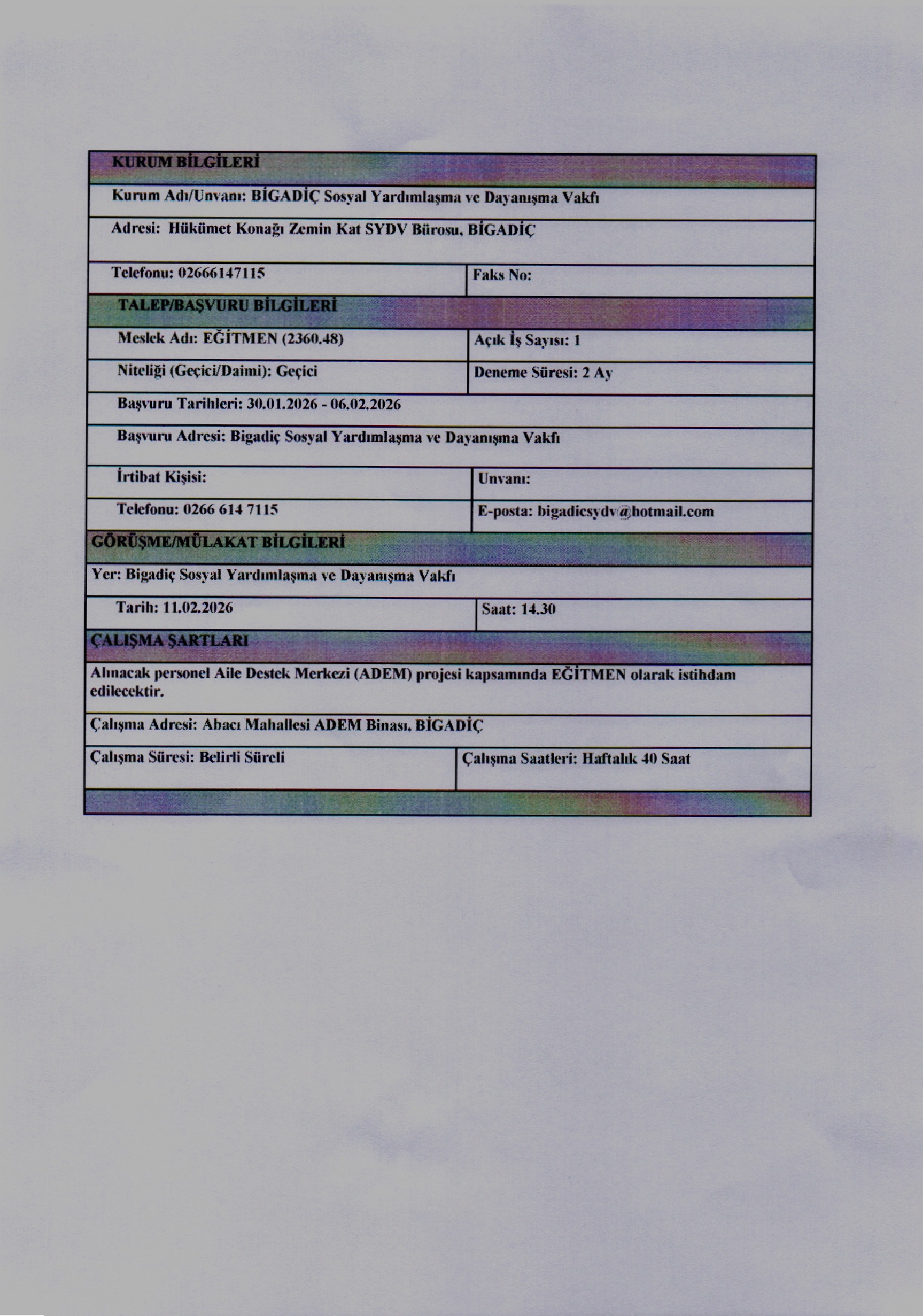 Bigadiç SYDV Geçici 1 İşçi Alacak. Son başvuru tarihi 6 Şubat 2026