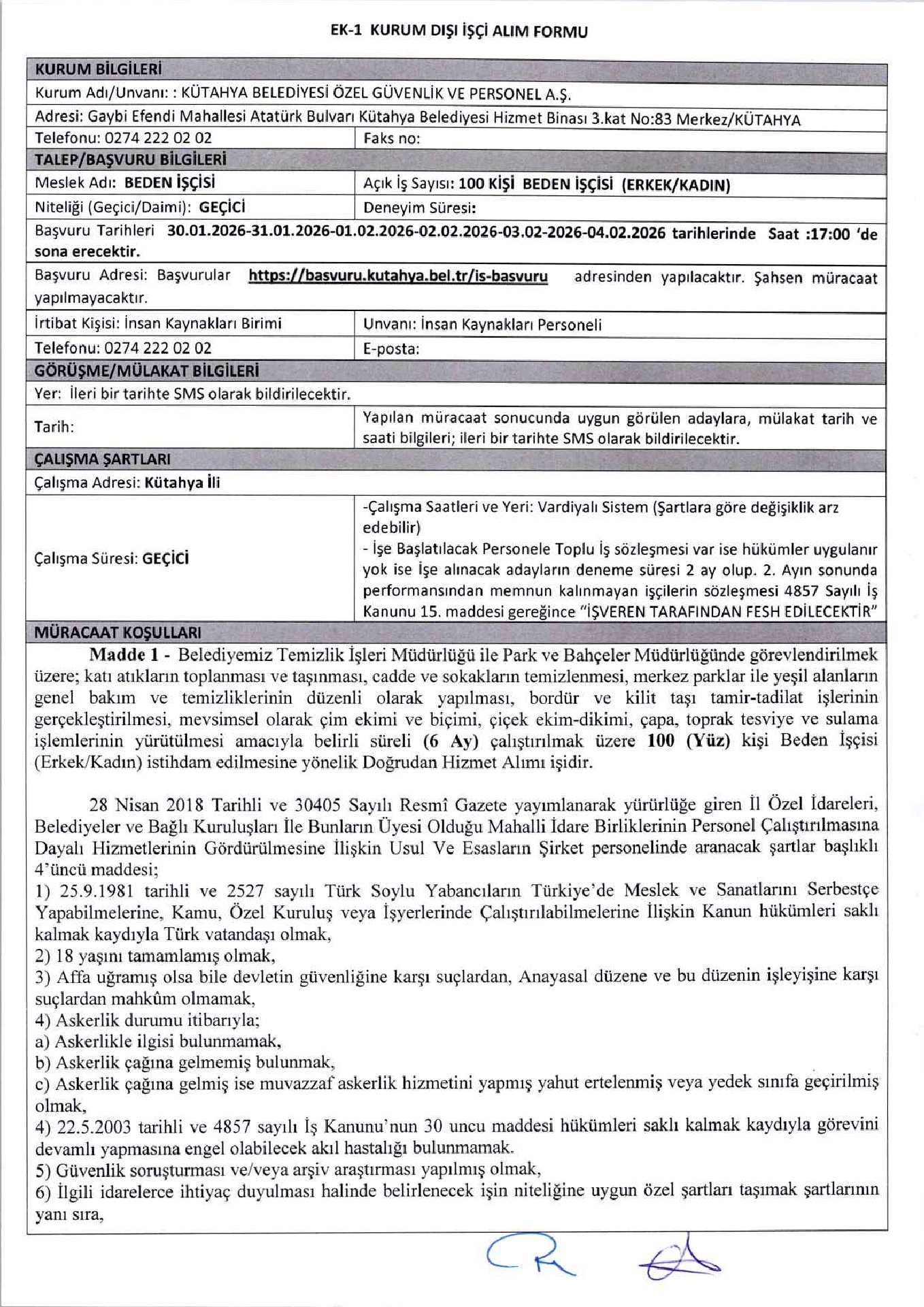 Kütahya SYDV Geçici 100 İşçi Alacak. Son başvuru tarihi 4 Şubat 2026