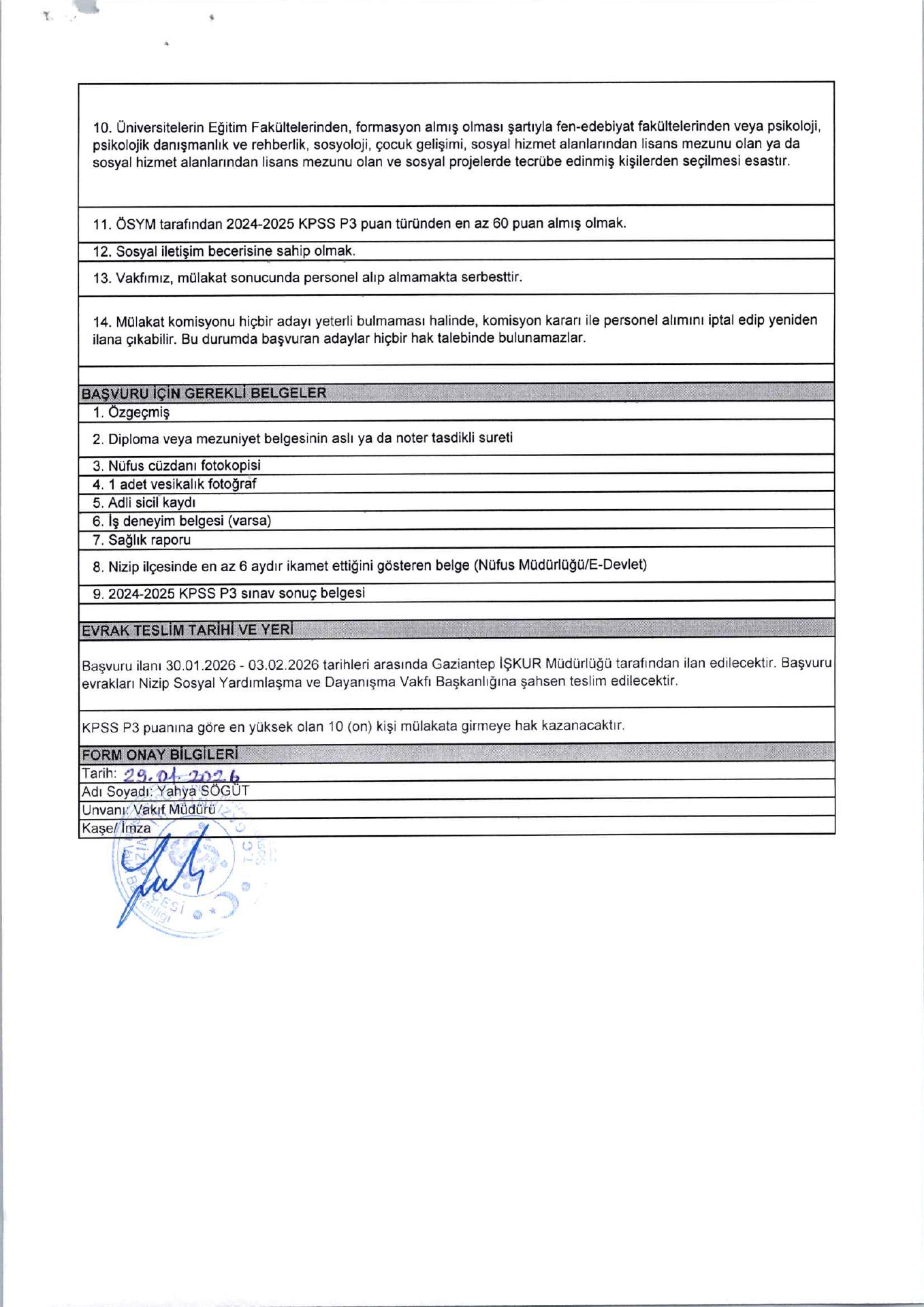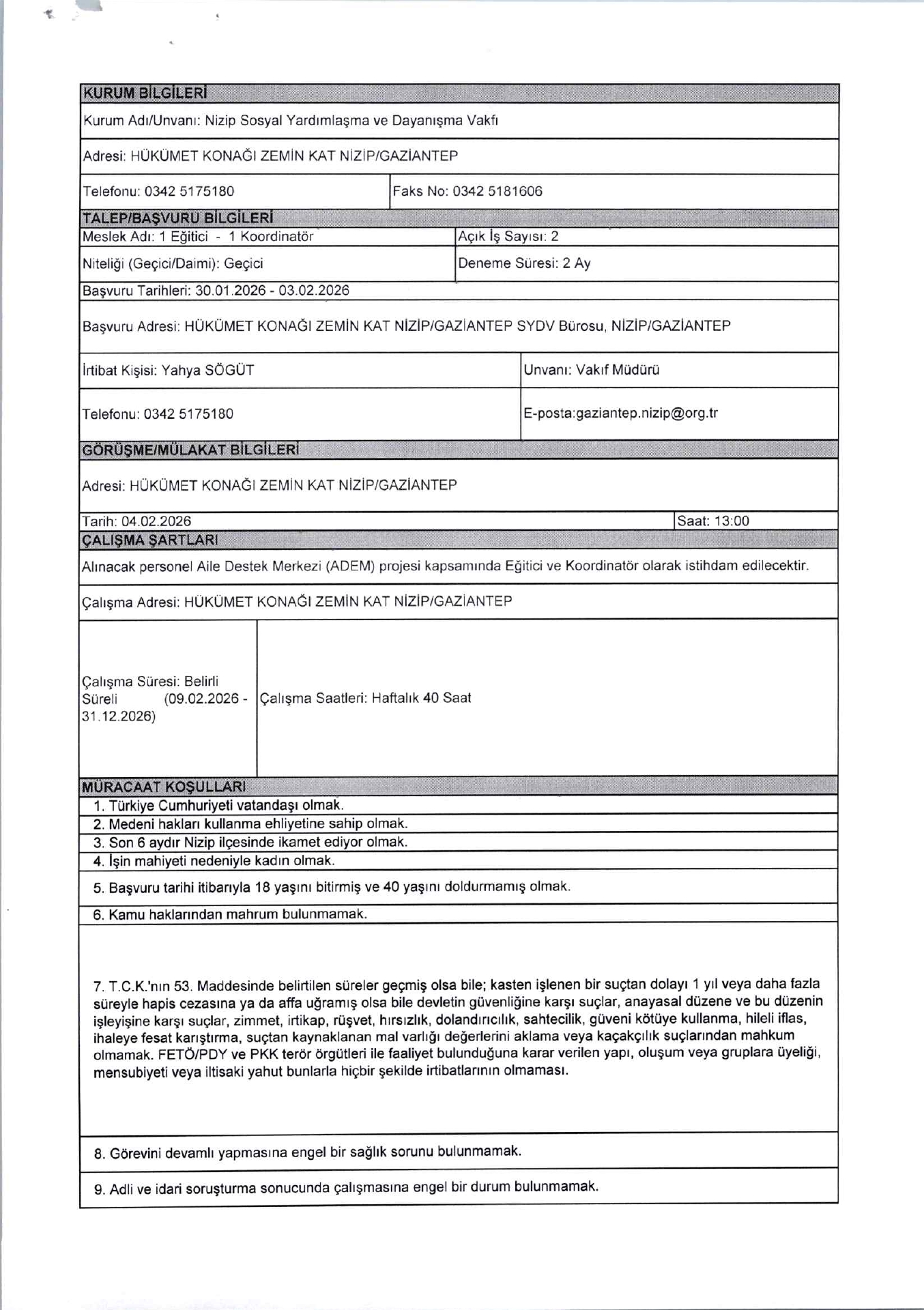 Gaziantep Nizip SYDV Geçici 2 İşçi Alacak. Son başvuru tarihi 3 Şubat 2026