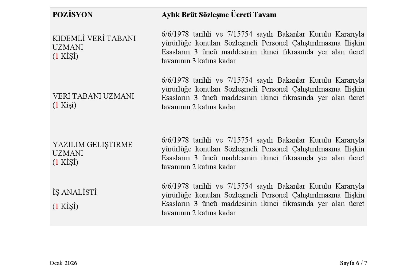 b) VERİ TABANI UZMANI (1 Kişi-Tam Zamanlı-Aylık Brüt Sözleşme Ücret Tavanının 2 Katına Kadar)