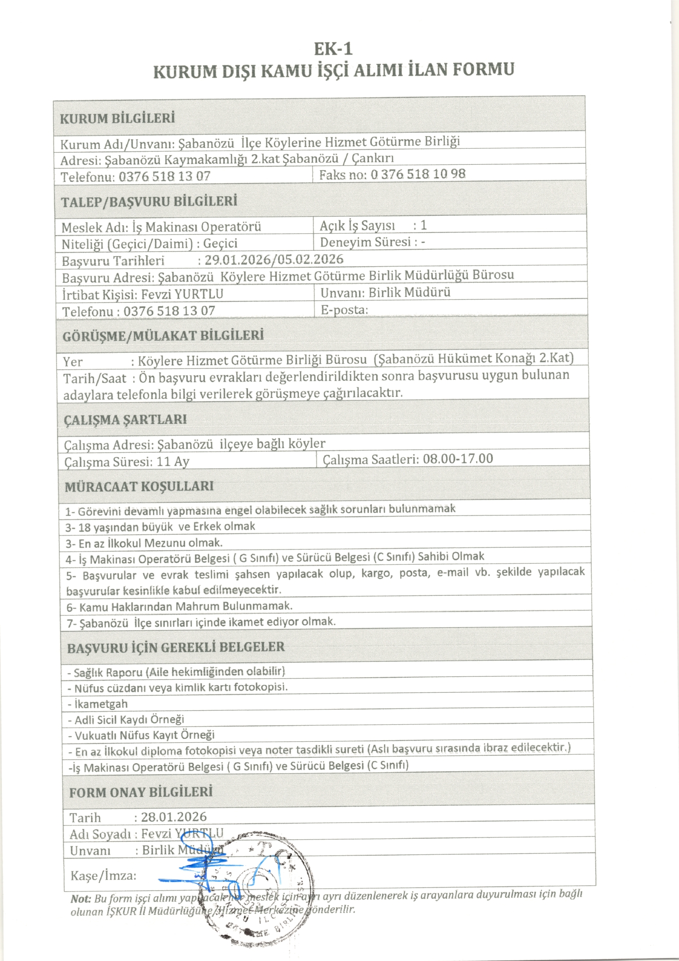 Çankırı Şabanözü Köylere Hizmet Götürme Birliği 1 İşçi Alacak. Son başvuru tarihi 5 Şubat 2026