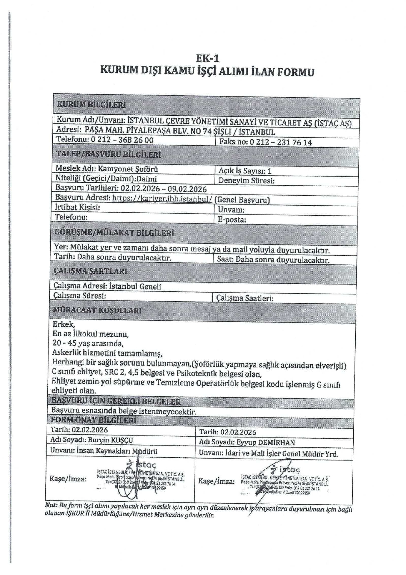 Ana sayfaDaimi İşçi İlanları İstanbul Çevre Yönetim 1 İşçi Alacak İstanbul Çevre Yönetim 1 İşçi Alacak. Son başvuru tarihi 9 Şubat 2026 Kaynak : İşkur İlan Giriş : 02 Şubat 2026 23:33, Son Güncelleme : 02 Şubat 2026 23:48 Yazdır Yorumlar (0) Abone Ol