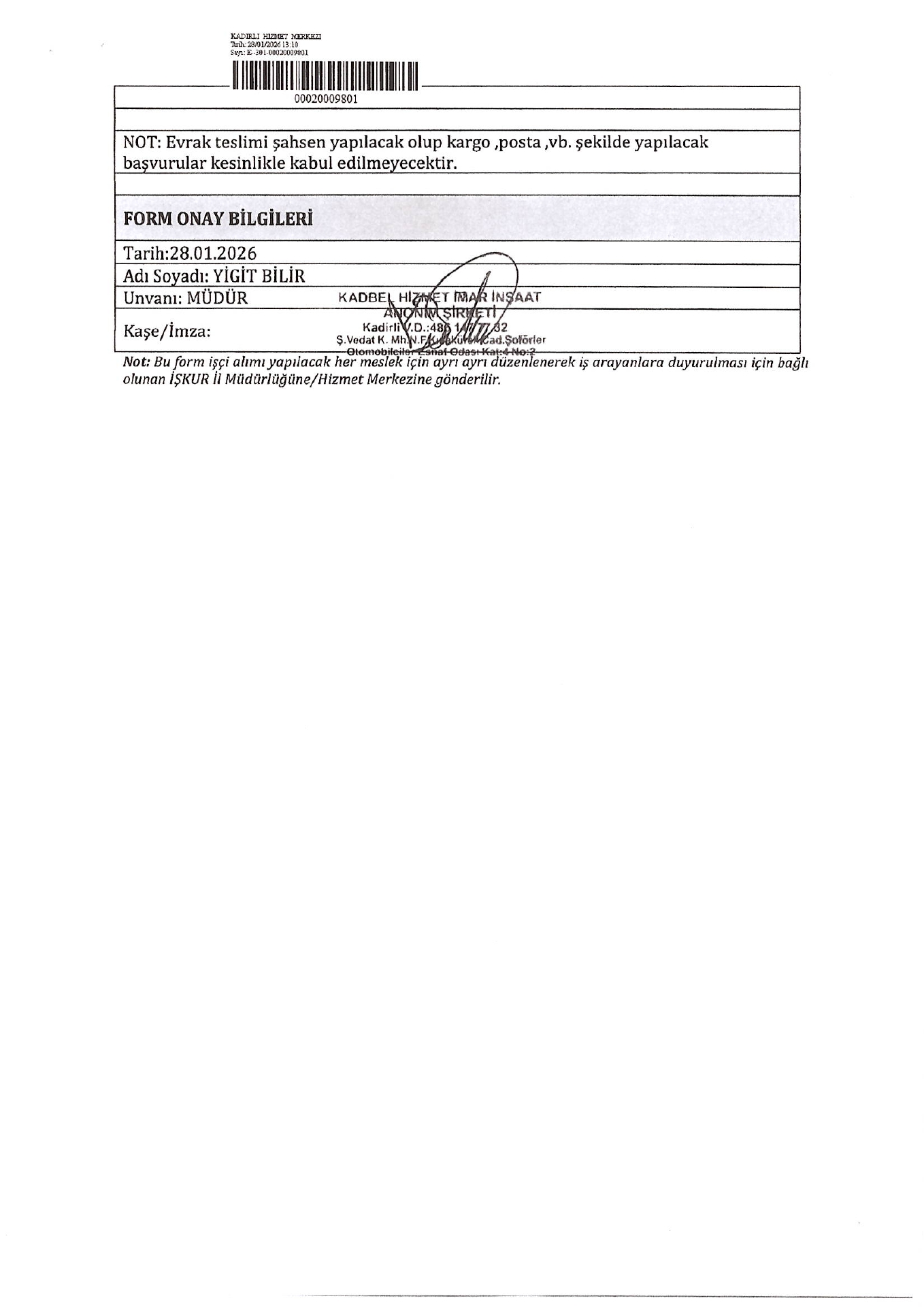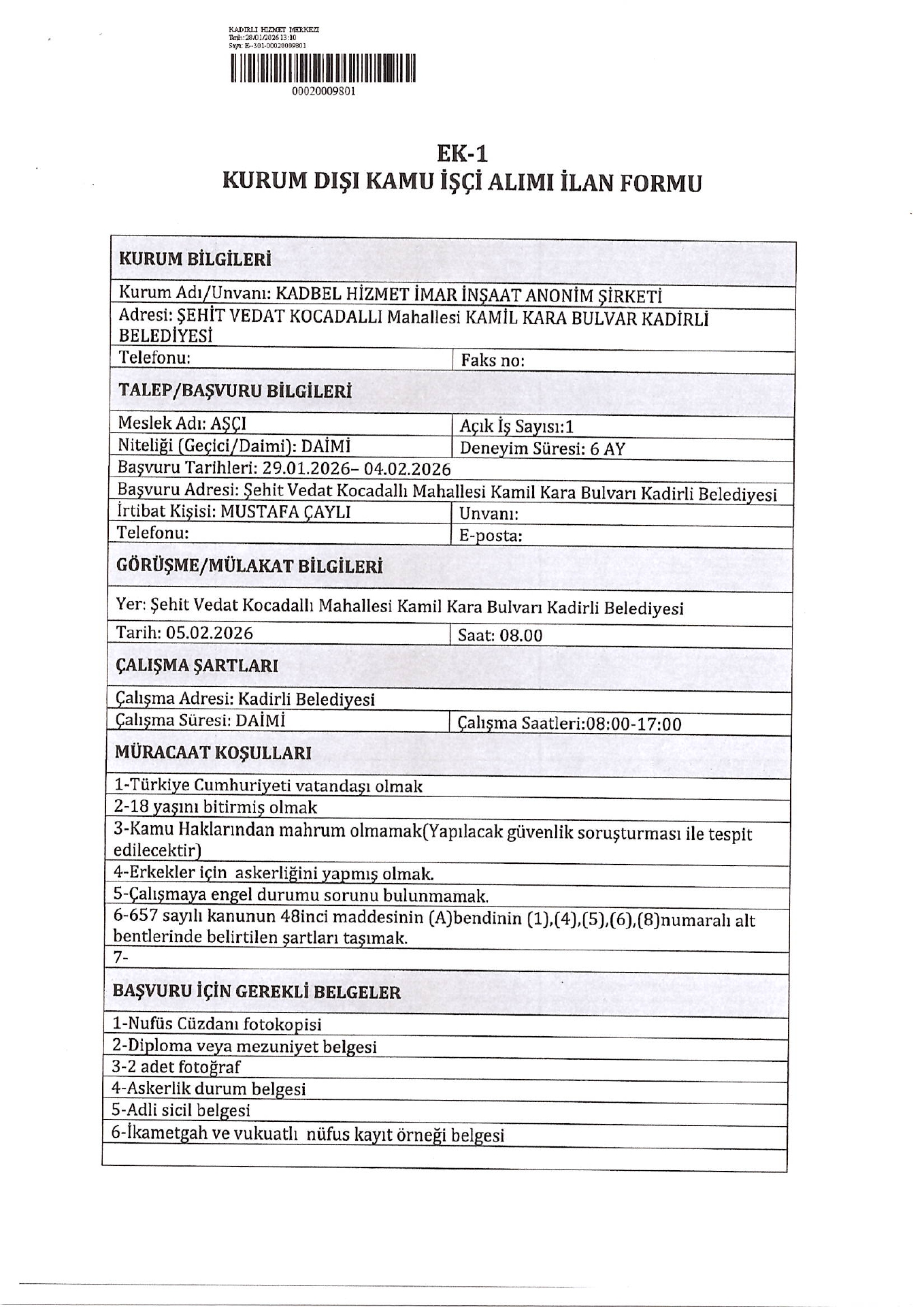 Ana sayfaDaimi İşçi İlanları Osmaniye Kadbel 1 İşçi Alacak Osmaniye Kadbel 1 İşçi Alacak. Son başvuru tarihi 4 Şubat 2026 Kaynak : İşkur İlan Giriş : 02 Şubat 2026 23:40, Son Güncelleme : 02 Şubat 2026 23:46 Yazdır Yorumlar (0) Abone Ol