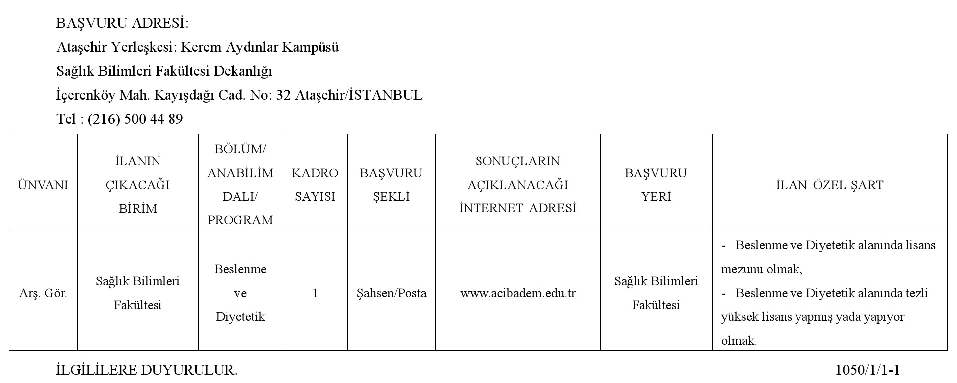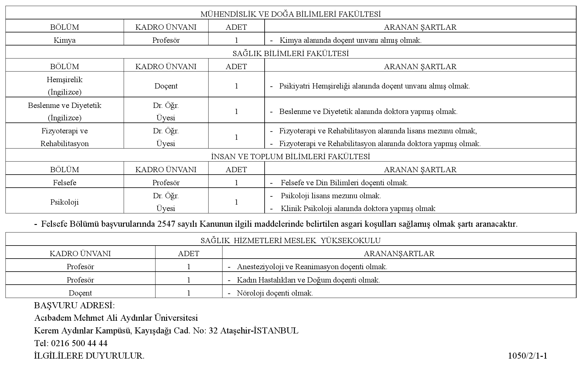 Üniversitemizin aşağıda belirtilen birimleri için 2547 sayılı Kanunun 26. 24. ve 23. maddesinde belirtilen asgari koşulların yanında, Üniversitemiz web sayfasında yayınlanan Acıbadem Mehmet Ali Aydınlar Üniversitesi Öğretim Üyeliğine Yükseltilme ve Atama Kriterlerini sağlamış olmak koşuluyla Profesör, Doçent ve Doktor Öğretim Üyesi alınacaktır.