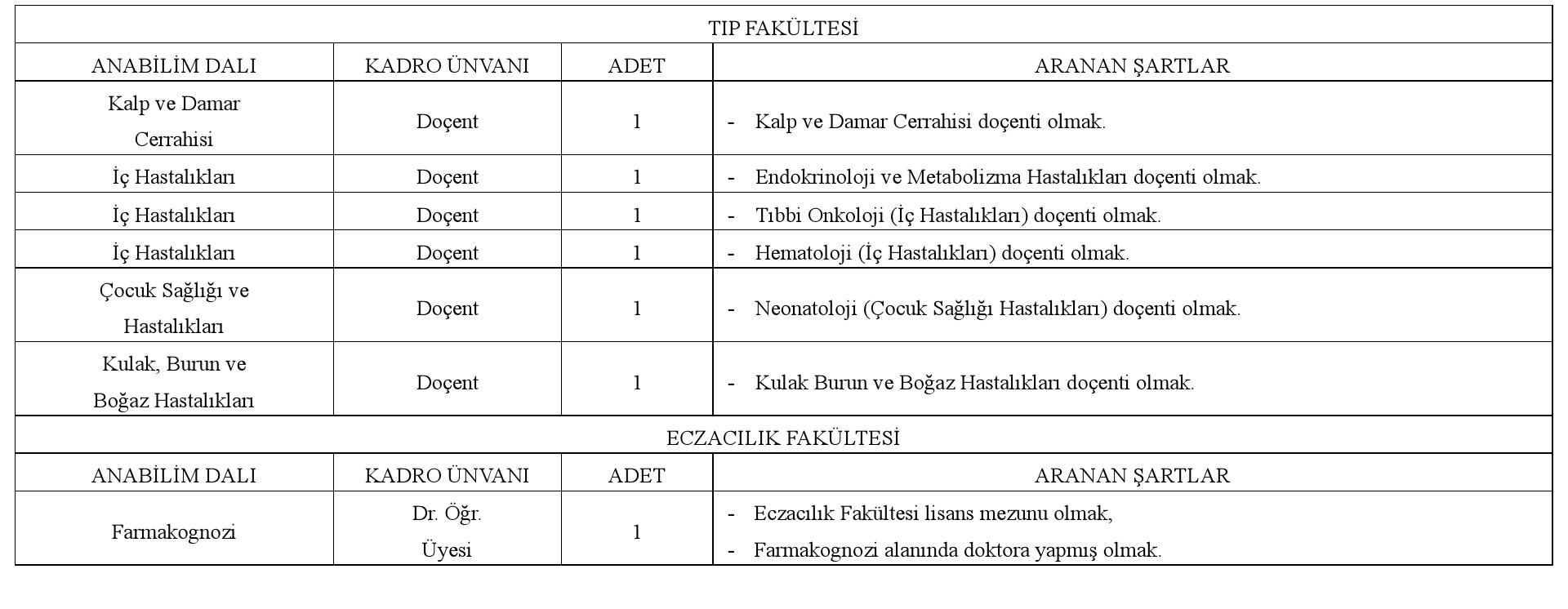 Doçent kadrosu daimi statüde olup, atanmak isteyen adayların özgeçmişlerini, noterden tasdikli doçentlik belgesini, bilimsel çalışma ve yayınlarını 4 takım halinde USB taşınabilir belleğe ekleyerek dilekçeyle birlikte ilan tarihinden itibaren Rektörlüğümüze on beş (15) gün içinde bizzat başvurmaları, ayrıca Doçent kadrosuna başvuracak adayların Üniversitelerarası Kurul tarafından değişecek bilim alanları için ayrı ayrı belirlenen ve halen yürürlükte olan Doçentlik kriterlerini sağlamış olmaları gerekmektedir.