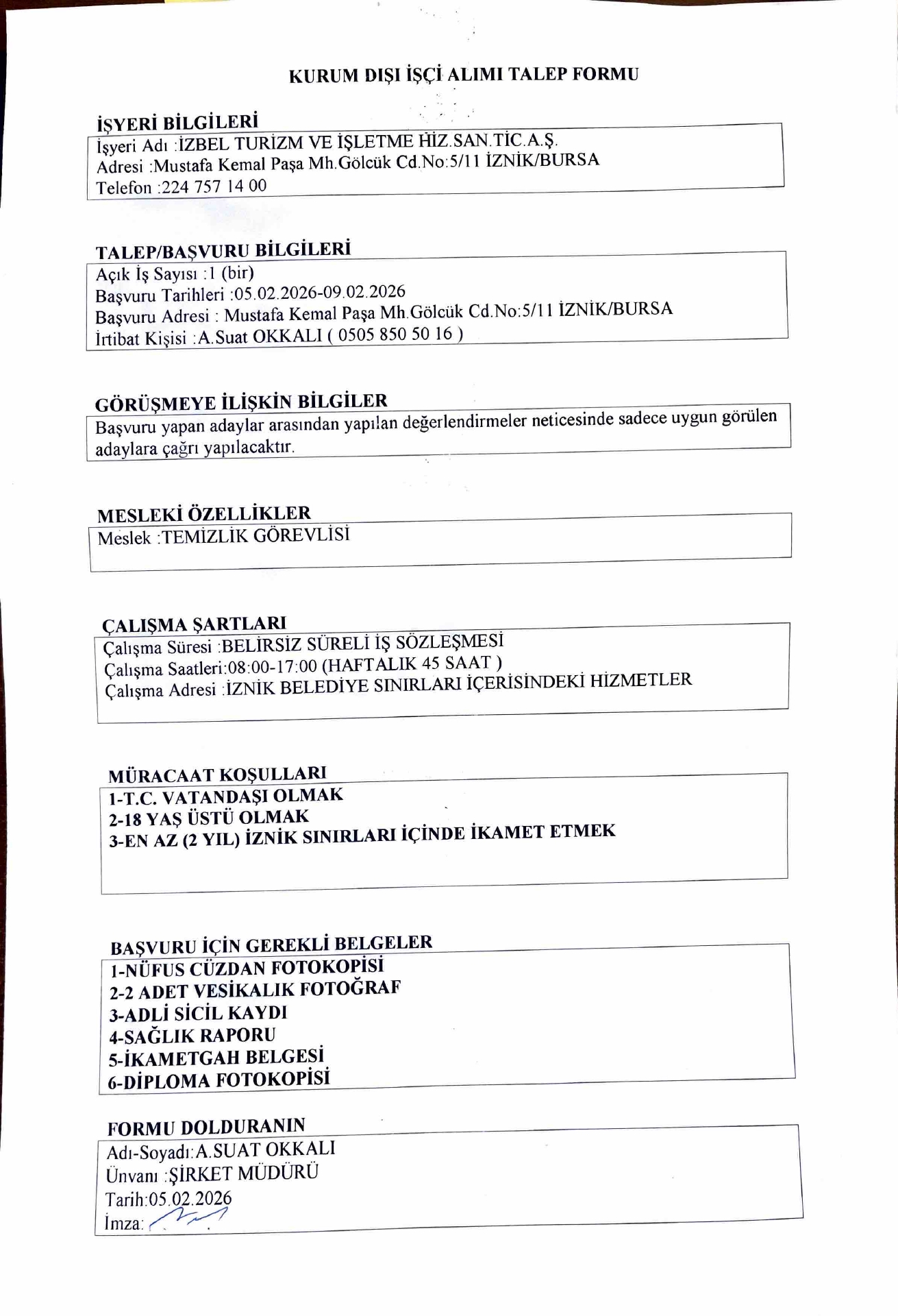 Ana sayfaDaimi İşçi İlanları İzmir İzbel Turizm 1 İşçi Alacak İzmir İzbel Turizm 1 İşçi Alacak. Son başvuru tarihi 9 Şubat 2026 Kaynak : İşkur İlan Giriş : 04 Şubat 2026 23:38, Son Güncelleme : 04 Şubat 2026 23:46 Yazdır Yorumlar (0) Abone Ol