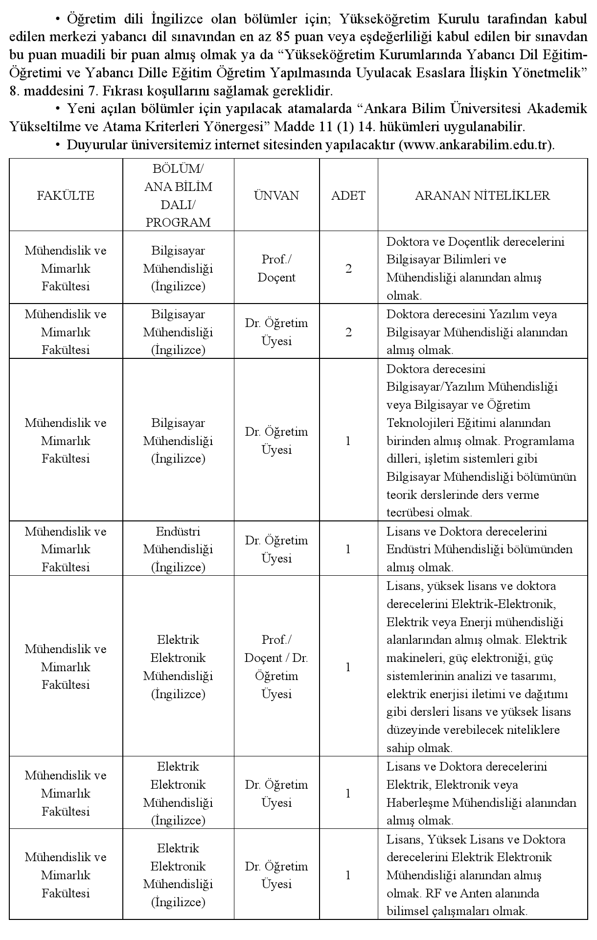 Yönergesinde aranan koşulları yerine getirmiş olmak kaydı ile aylık ve özlük hakları yönünden 4857 sayılı İş Kanunu hükümlerine tabi olarak aşağıda belirtilen bölümlere öğretim üyeleri alınacaktır. İlana konu olan kadrolar tam zamanlıdır. Müracaat edecek adayların ilgili yönetmelik ve yönerge hükümlerinde belirtilen asgari başvuru koşullarını sağlamaları ve aşağıda istenilen belgeler ile birlikte Ankara Bilim Üniversitesi Rektörlüğüne şahsen veya posta yoluyla başvurmaları gerekmektedir. Başvuru süreci Resmi Gazete yayım tarihinden itibaren 15 (on beş)
