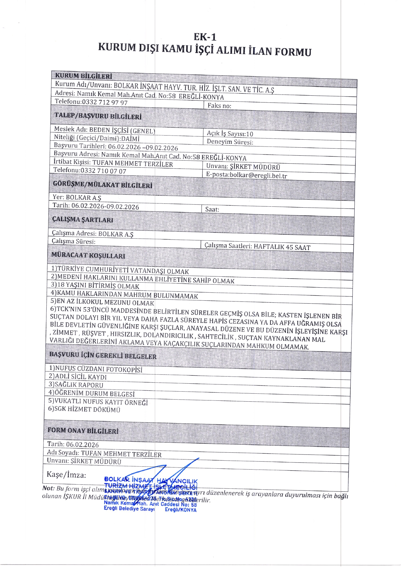 Ana sayfaDaimi İşçi İlanları Konya Bolkar İnşaat 10 İşçi Alacak Konya Bolkar İnşaat 10 İşçi Alacak. Son başvuru tarihi 9 Şubat 2026 Kaynak : İşkur İlan Giriş : 06 Şubat 2026 22:44, Son Güncelleme : 06 Şubat 2026 22:23 Yazdır Yorumlar (0) Abone Ol